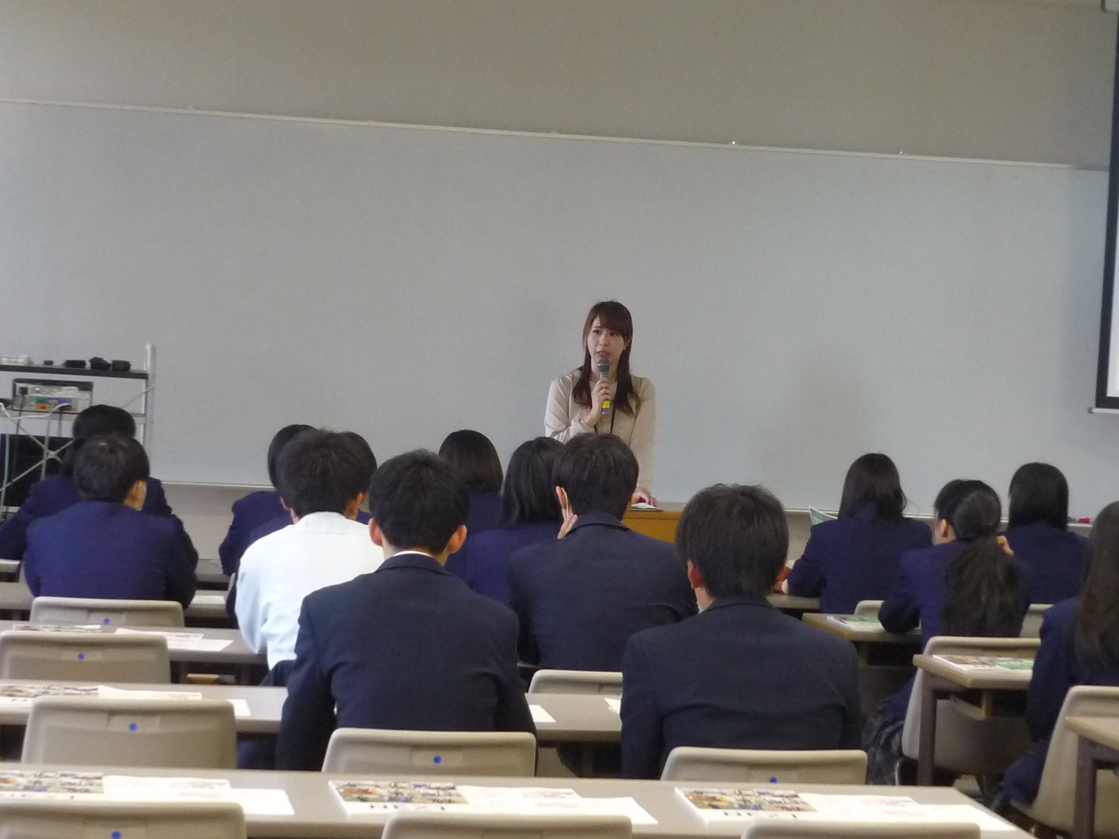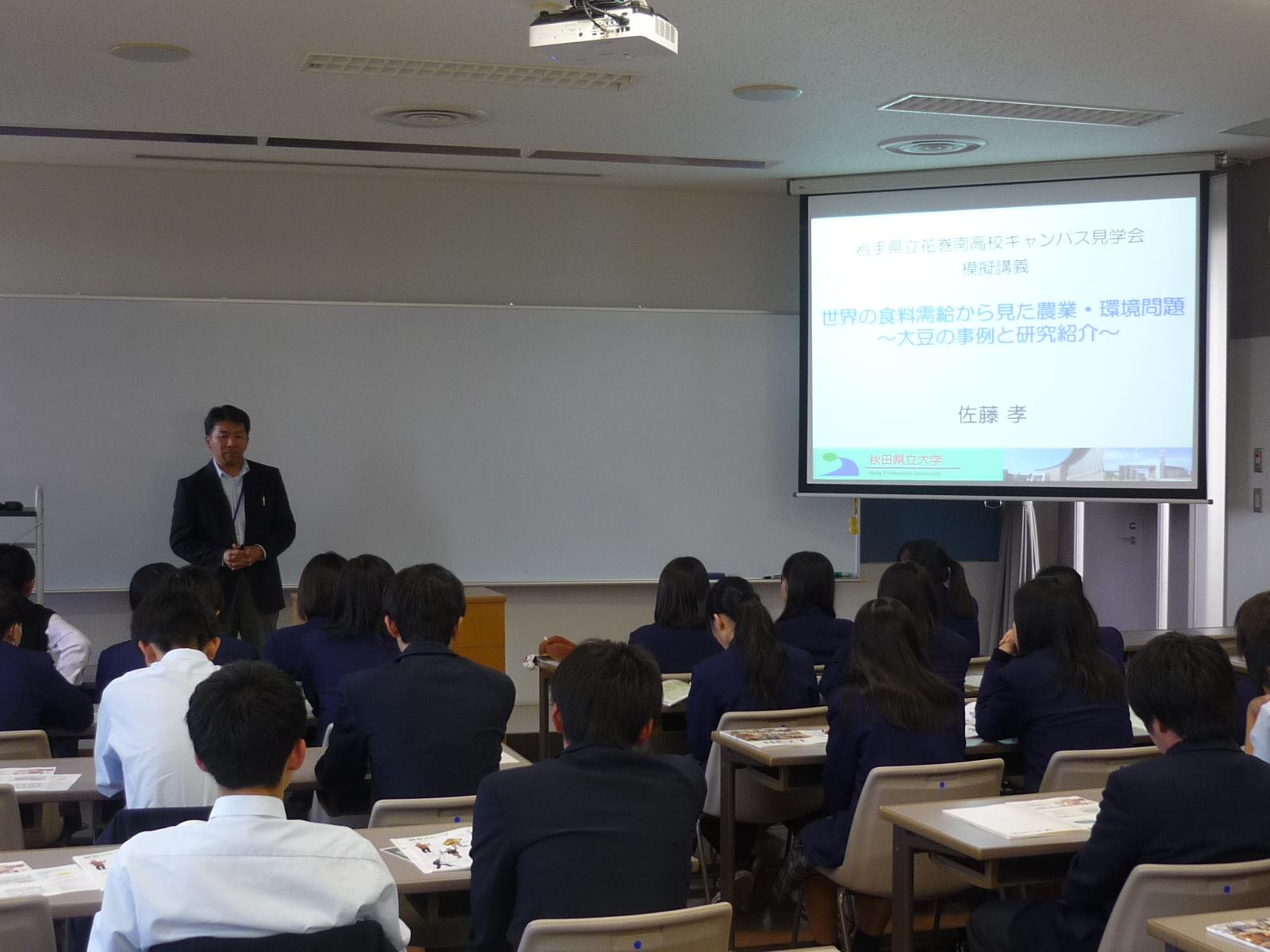 10月9日(水)、岩手県立花巻南高校の2年生39名の生徒さんと引率教員2名が秋田キャンパスを見学しました。これは、花巻南高校の生徒さんが、進路希望に応じて大学を見学することにより、上級学校に対する理解を深め、今後の進路実現につなげることをねらいとした「進路見学会」の一環として実施されたものです。秋田県立大学の概要などについて説明を受けた後、生物資源科学部の佐藤 孝 准教授(生物環境科学科)による模擬講義が行われました。佐藤先生からは、『世界の食糧需給から見た農業・環境問題~大豆の事例と研究紹介~』というテーマで講義を進めていただき、私たちが毎日のように口にする大豆がどのように生産され、その背景にある世界規模の農業・環境問題について知り、さらに、新しい技術で日本国内での大豆生産性の向上をめざす佐藤先生の研究も紹介されました。