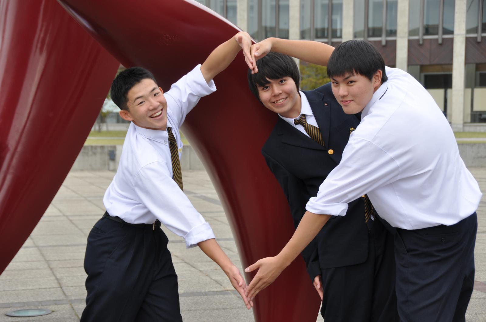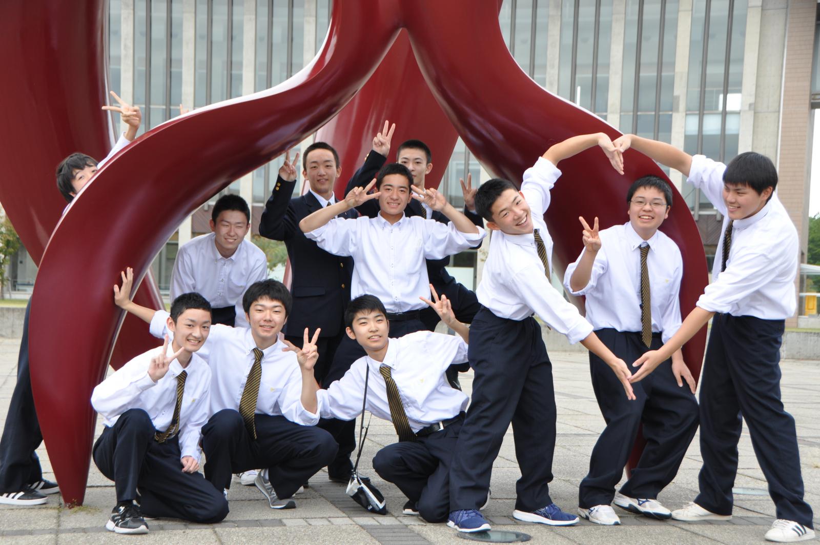 模擬講義の後は、3班に分かれて、講堂、図書館、キャリア情報センター、学生ホールなど、広大なキャンパスをじっくり見学いただきました。高校生の皆さんは、キャンパスに配置された秋田の豊かな自然に関係した3つオブジェに興味津々で見入っていました。(みんなで記念撮影も行いました)