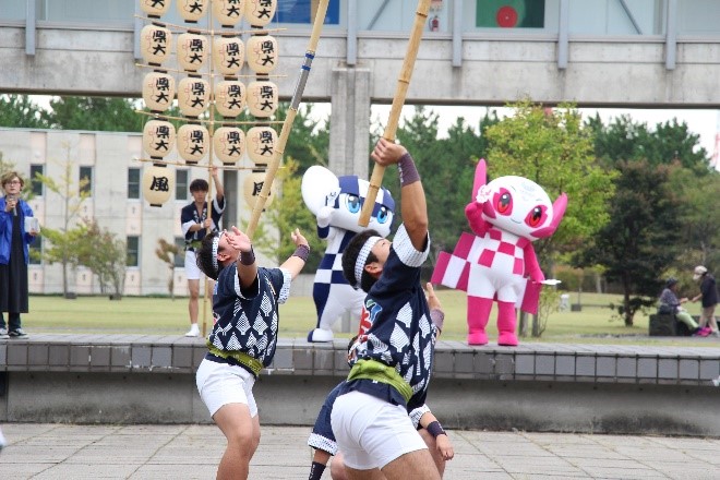 1日目は東京2020大会PRブースも出展し、竿燈会の演技には東京2020オリンピックマスコット「ミライトワ」と東京2020パラリンピックマスコット「ソメイティ」も登場!来場者と一緒に竿燈を楽しみました。その後、グリーティングイベントも開催されました。
