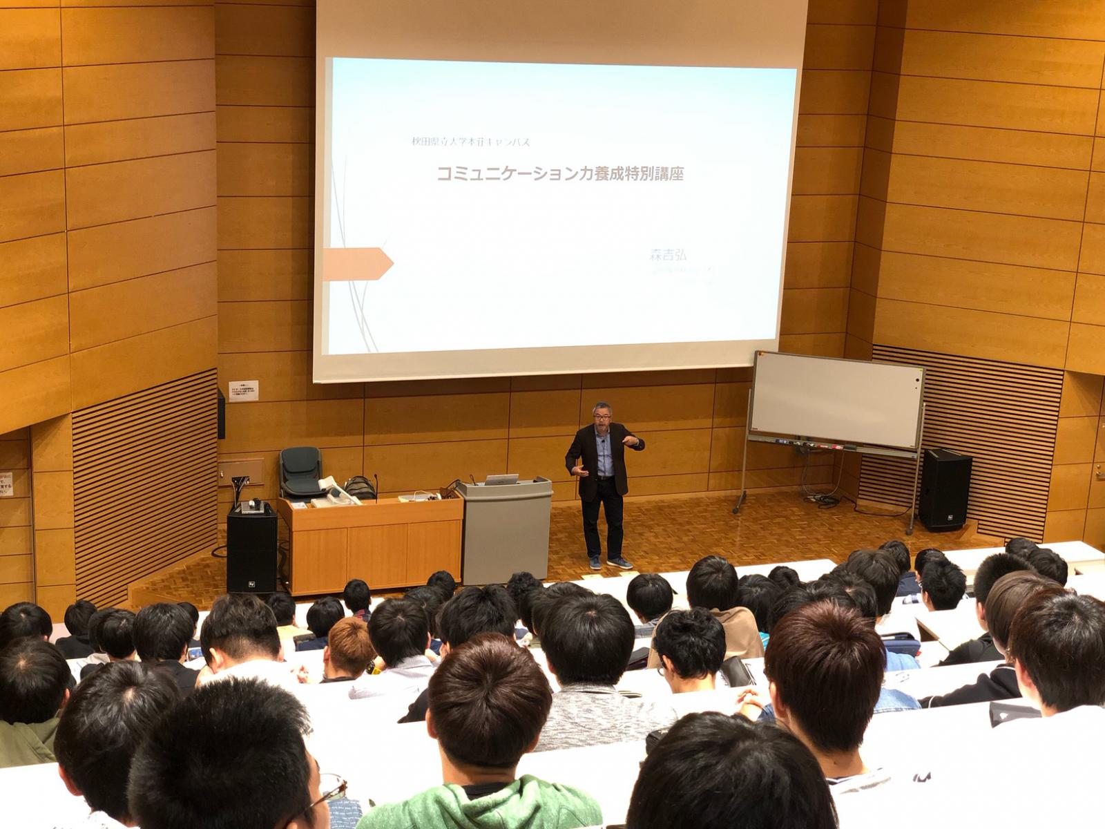 今年で7回目を迎える「秋田県立大学 森ゼミ」の全体講演(初回講義)が、10月10日(木) 本荘キャンパスを会場に行われました。「森ゼミ」は元NHKアナウンサーの 森 吉弘 氏が主宰するゼミで、早い段階から自身のキャリア形成について考えるきっかけを作ることを目的に平成25年より開講しています。