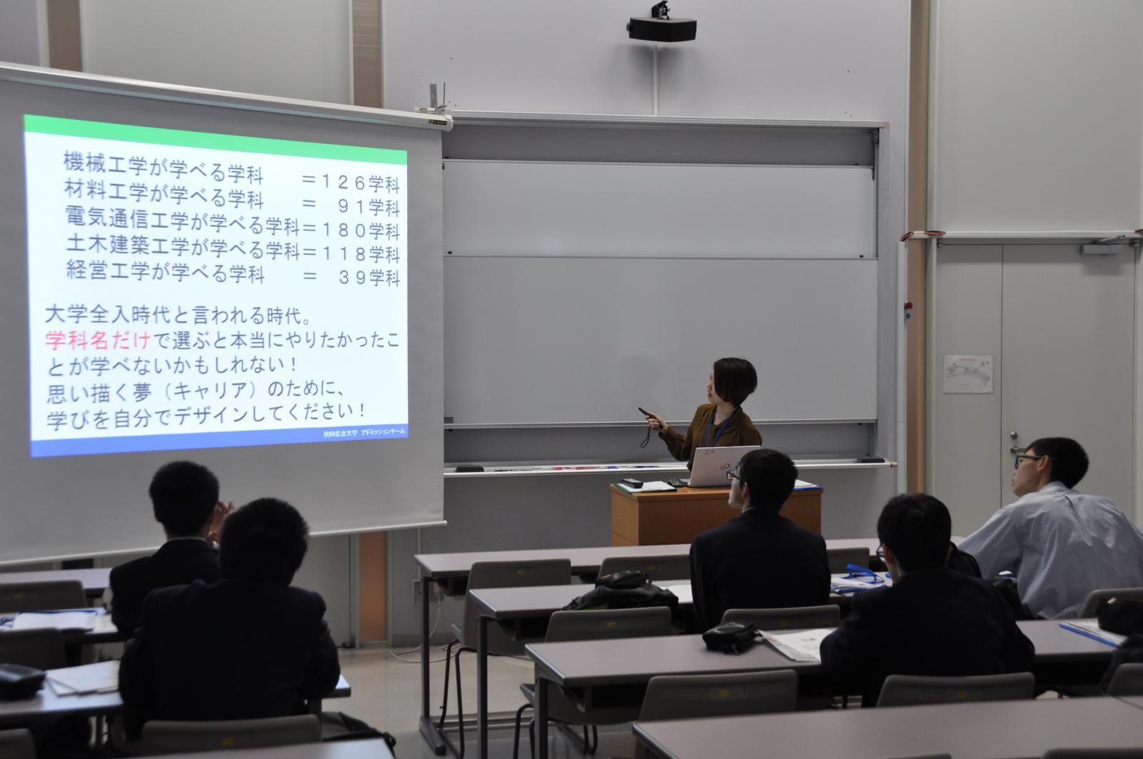 10月21日(月)、青森県立六ヶ所高校の1・2年生8名の生徒さんが、本荘キャンパスを見学しました。これは、六ヶ所高校の生徒さんが大学での学びについて知り、進路選択の見識を深めるために実施されたものです。カフェテリアでの学食体験や大学の紹介のほか、知能メカトロニクス学科齋藤敬准教授の模擬講義も体験いただきました。模擬講義は「バイオとロボット、自分たちでメカを作って問題解決」をテーマに、齋藤准教授の研究室が作成したロボット「しろやぎ」も登場し、生徒さんたちは興味津々の様子でした。講義では研究の紹介だけではなく、研究者としての姿勢や高校生の皆さんに向けたアドバイスのお話しもありました。