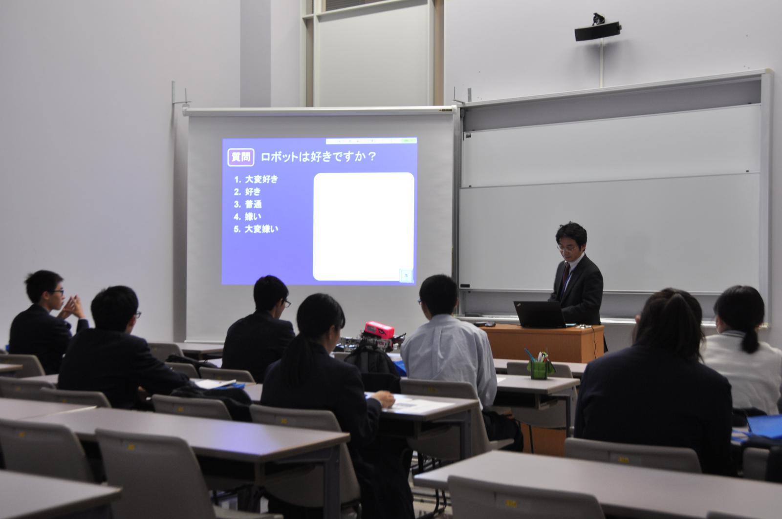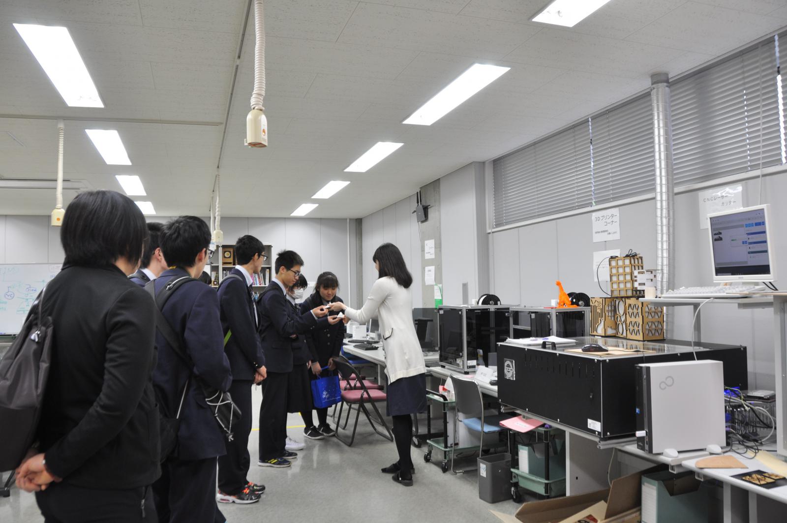 施設見学では、大学の広い学部棟や図書館、工学系ならではの実験室やものづくり施設のほか、「知能メカトロニクス通論Ⅰ」の講義もご覧いただき、大学での講義や学生の学びの一端にも触れていただきました。
