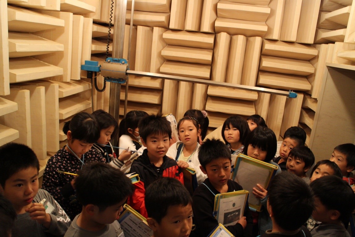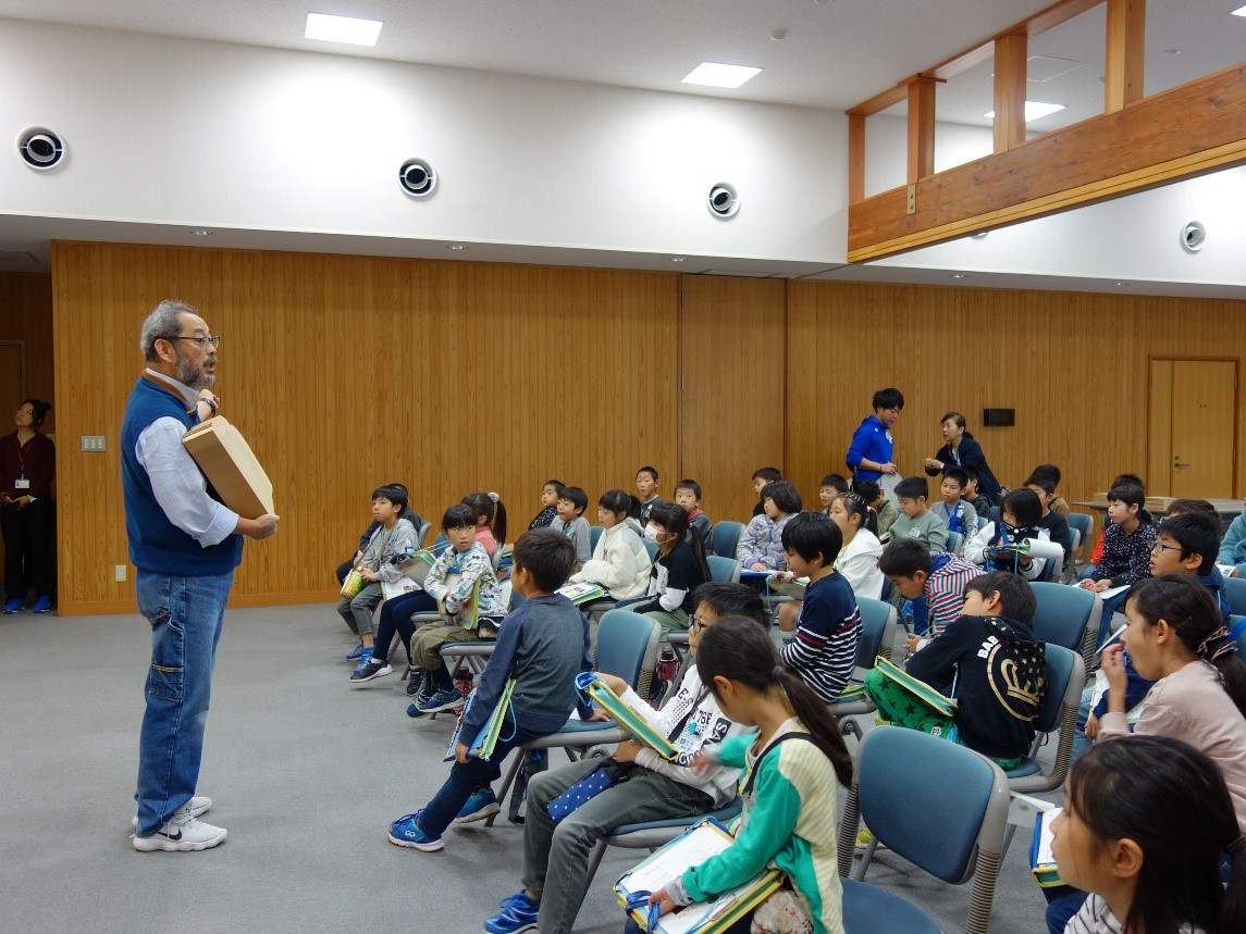 10月24日(木)、能代市立渟城南小学校3年48人のちびっこ隊員が総合的な学習の時間を活用して木材高度加工研究所探検に訪れました。最初に、高田 克彦 教授と渡辺 千明 准教授から、研究所の概要や樹木のことについて説明を受けました。