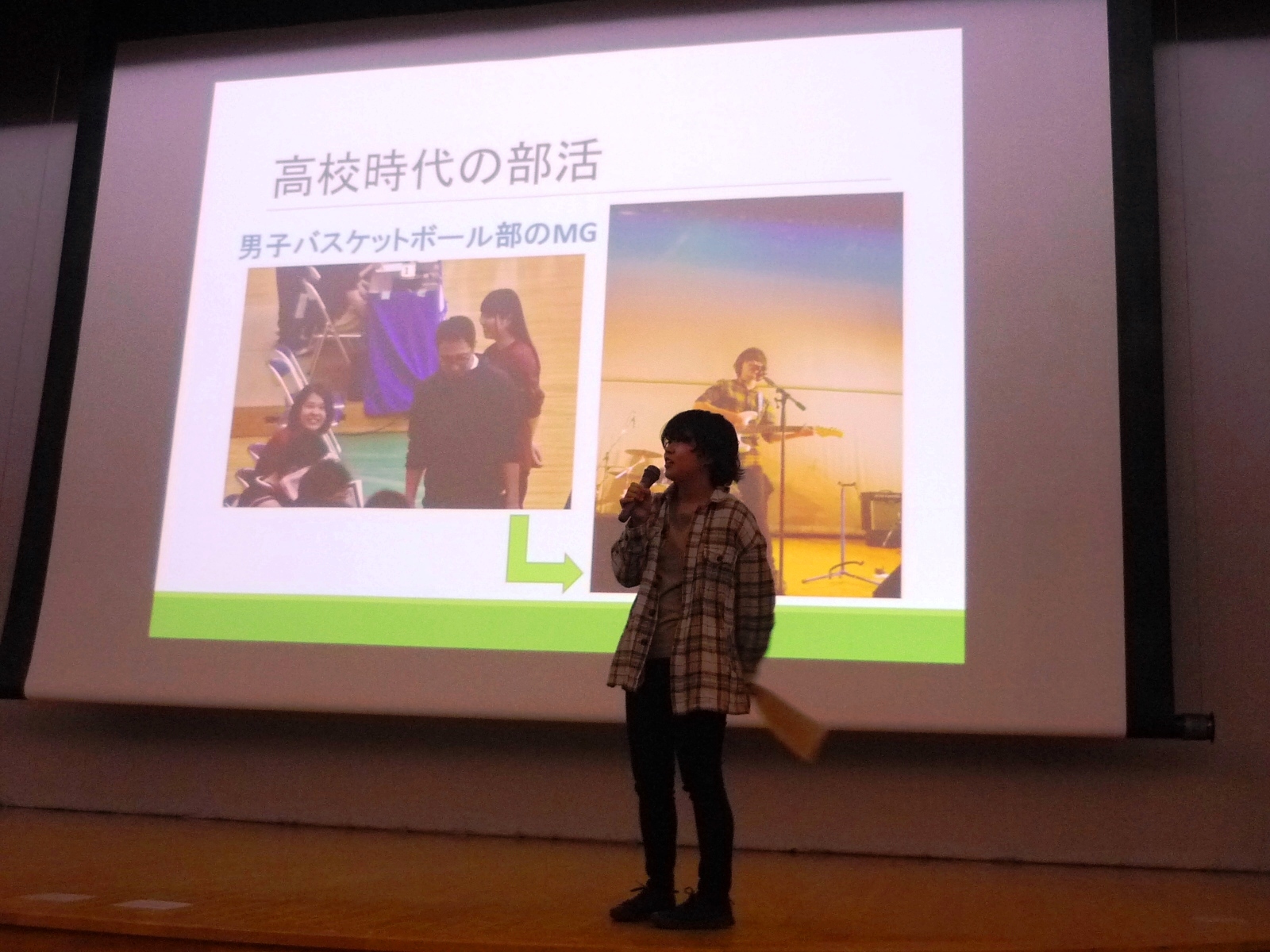 施設見学の後は、能代高校の卒業生で生物環境科学科2年の鷲尾環さんによる『卒業生の講話』がありました。鷲尾さんからは、生物環境科学科を志望した理由や県大で良かったこと、能代高校の生徒のみなさんへ向けたメッセージなどを話していただきました。鷲尾さん自らマイクを持って生徒さんへ質問に走るなど、和気あいあいとした雰囲気での交流となりました。