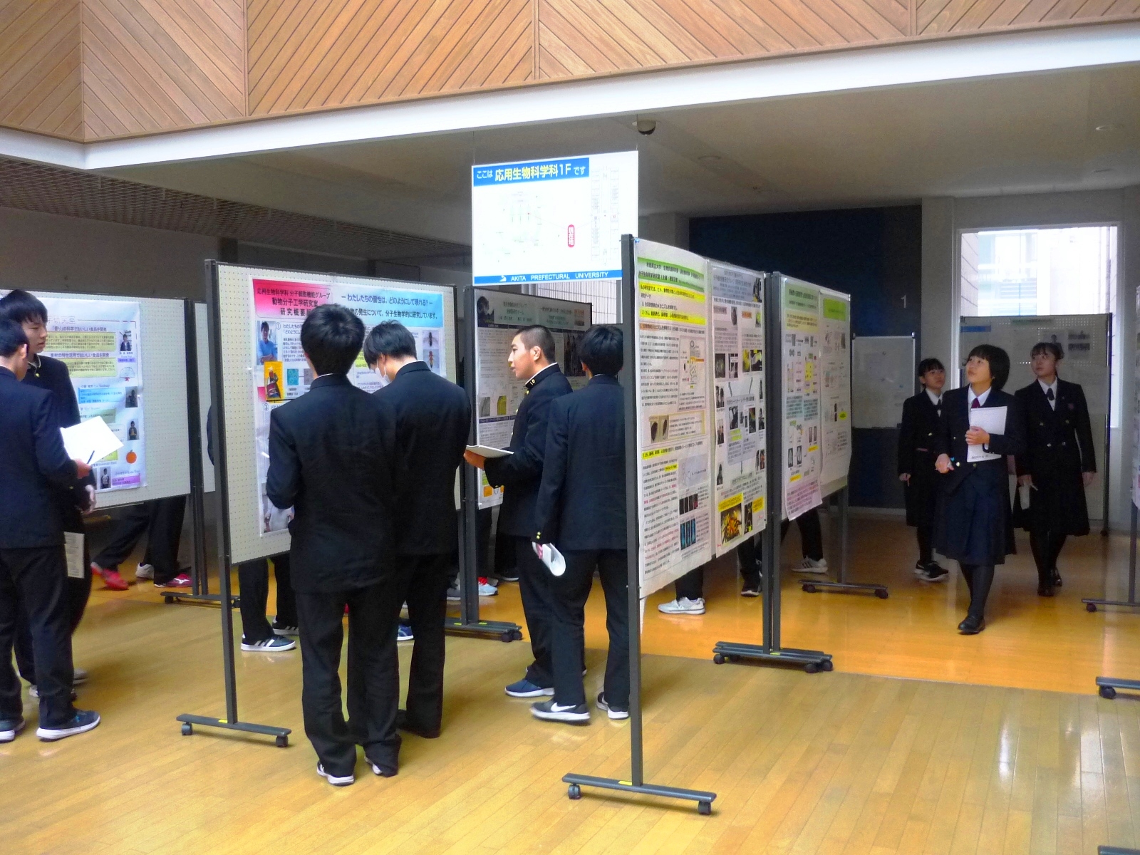 秋田県立大学の概要説明を受けた後は、キャンパスマップを手に、広いキャンパスを自由に見学しました。学部棟の研究ポスターや講堂横の学生自主研究のポスターを見ながら、一生懸命メモを取る生徒さん方の姿が印象的でした。