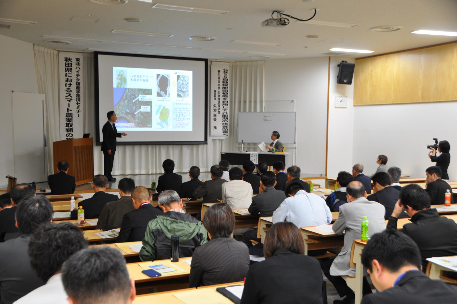 10月30日(水)、秋田市のカレッジプラザにおいて、農林水産省及び東北地域農林水産・食品ハイテク研究会との共催により、産学連携セミナー「秋田県におけるスマート農業取組の現状」を開催しました。当日は、大学等の教育関係者や、農業従事者、行政機関、一般市民など、県内外から約100人が参加し、基調講演やポスターセッションなどを通じて、秋田県におけるスマート農業の取り組みなどについて理解を深めました。基調講演では、生物資源科学部の矢治 幸夫 客員教授(フィールド教育研究センター)から、大潟村で実証を進めている高精度GPS装置RTK-GNSSシステムを活用した自動操舵田植機について紹介がありました。矢治先生からは、「オペレータが自動操舵時には直進するための操舵を行わず、苗の植付状態の確認に専念できるため負担軽減につながる。また、マーカーが不要で田植え時の代かき水を排水せずに湛水したまま作業が可能であるため、排水による八郎湖への環境負荷物質の流入を削減し水質改善も期待できる」との説明がありました。