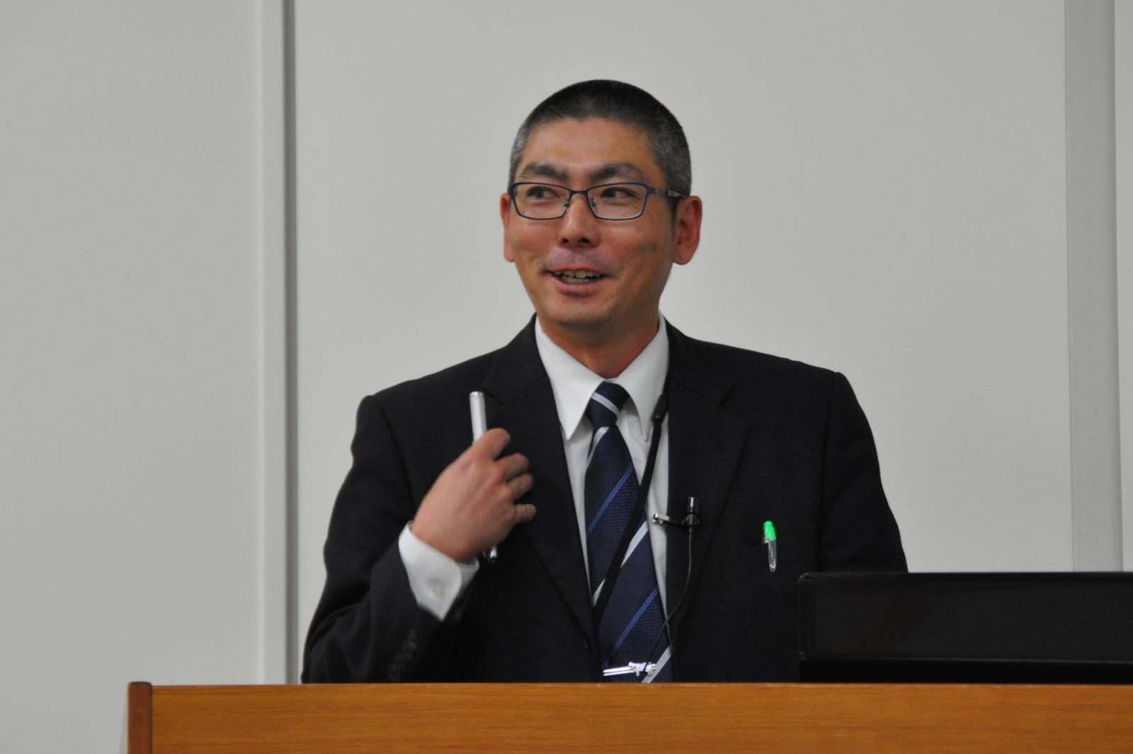 生物資源科学部の渡邊 潤 准教授(フィールド教育研究センター)から、本学フィールド教育研究センター圃場で飼育されている日本短角種の繁殖管理へのAI活用について紹介がありました。渡邊先生からは、「発情発見を補助し人工授精の適期を知らせる機器を活用している。牛個体を学習する人工知能が導入されており、活動情報を個体別に学習し、個体差を考慮したデータ解析の結果が通知される。また、疾病などの異常発生の疑いについても通知される。AI活用により効率的な家畜の飼養管理に繋がっている。」との説明がありました。