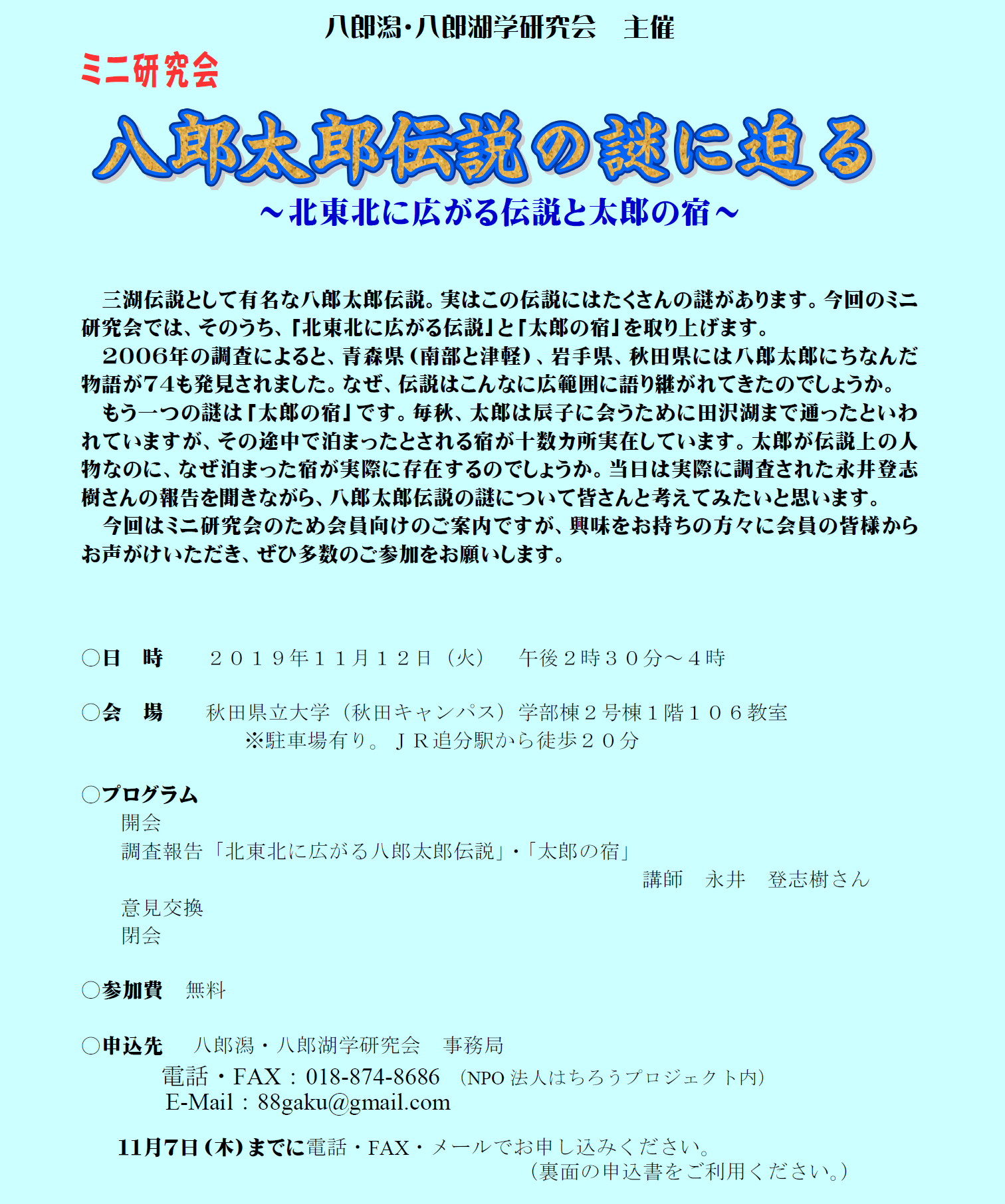 ◆申込先 : 11月7日(木)まで八郎潟・八郎湖学研究会事務局まで