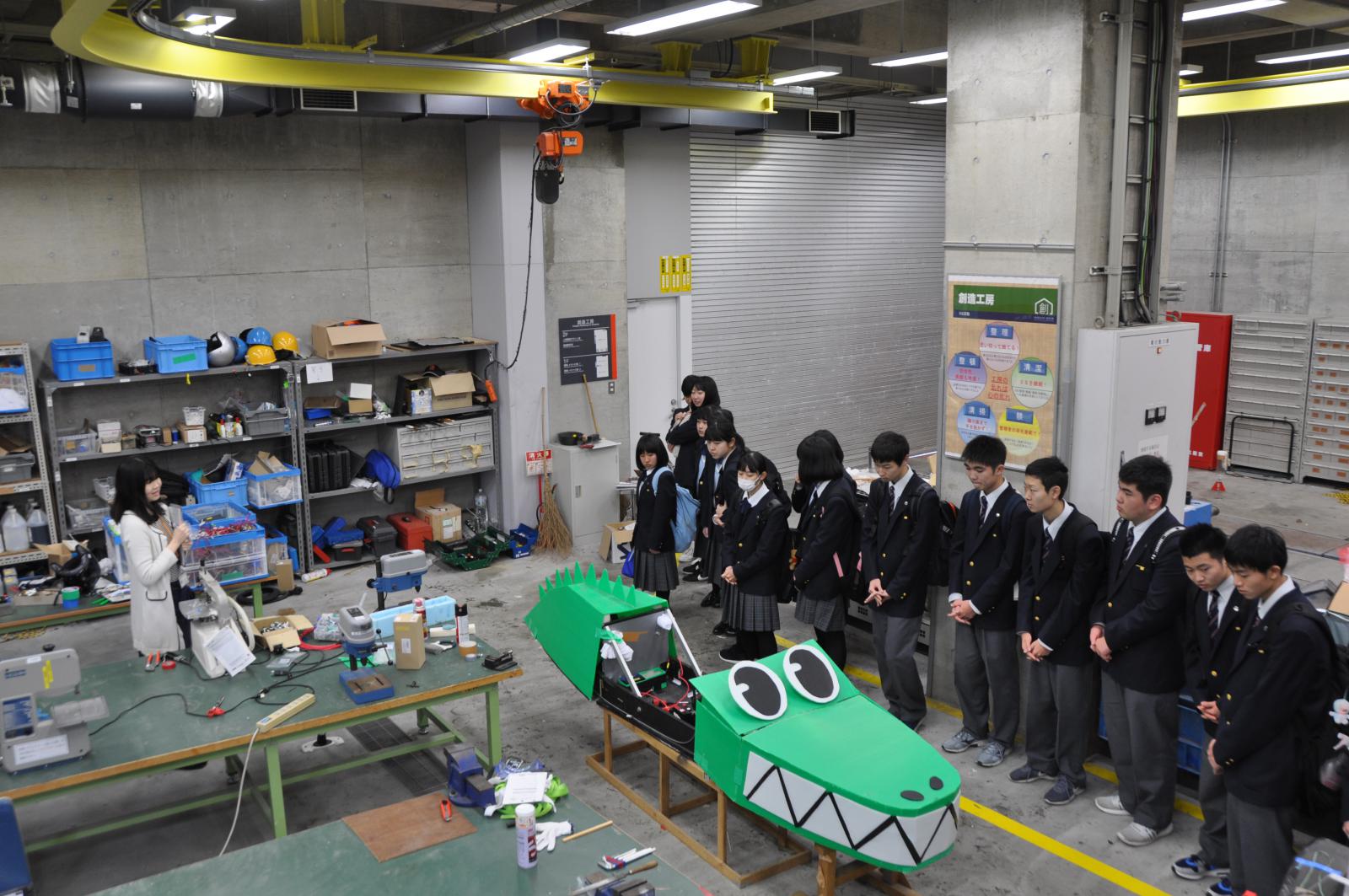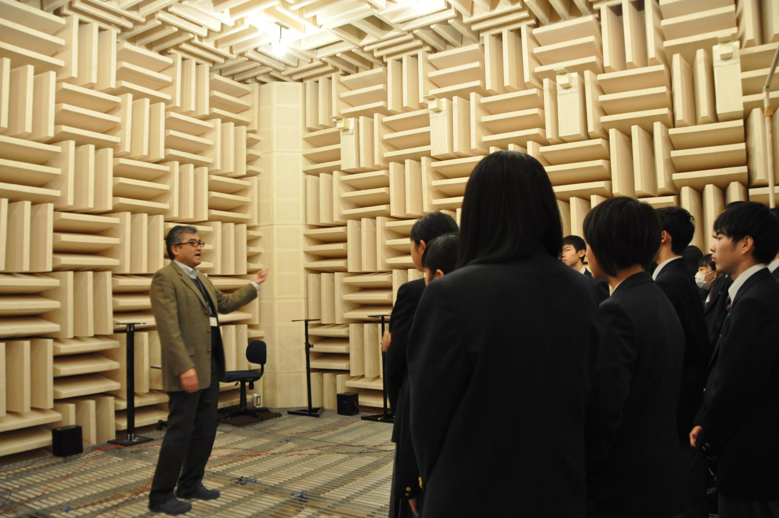 本荘キャンパスでは、大学の概要説明の後、2班に分かれて施設見学を行いました。学生が自由に使えるものづくり施設『創造工房』や、情報工学科の『多目的音響実験室』では、普段見ることのできない機器や特殊な環境に驚いた様子でしたが、担当者の説明を真剣に一生懸命聞いている姿が印象的でした。