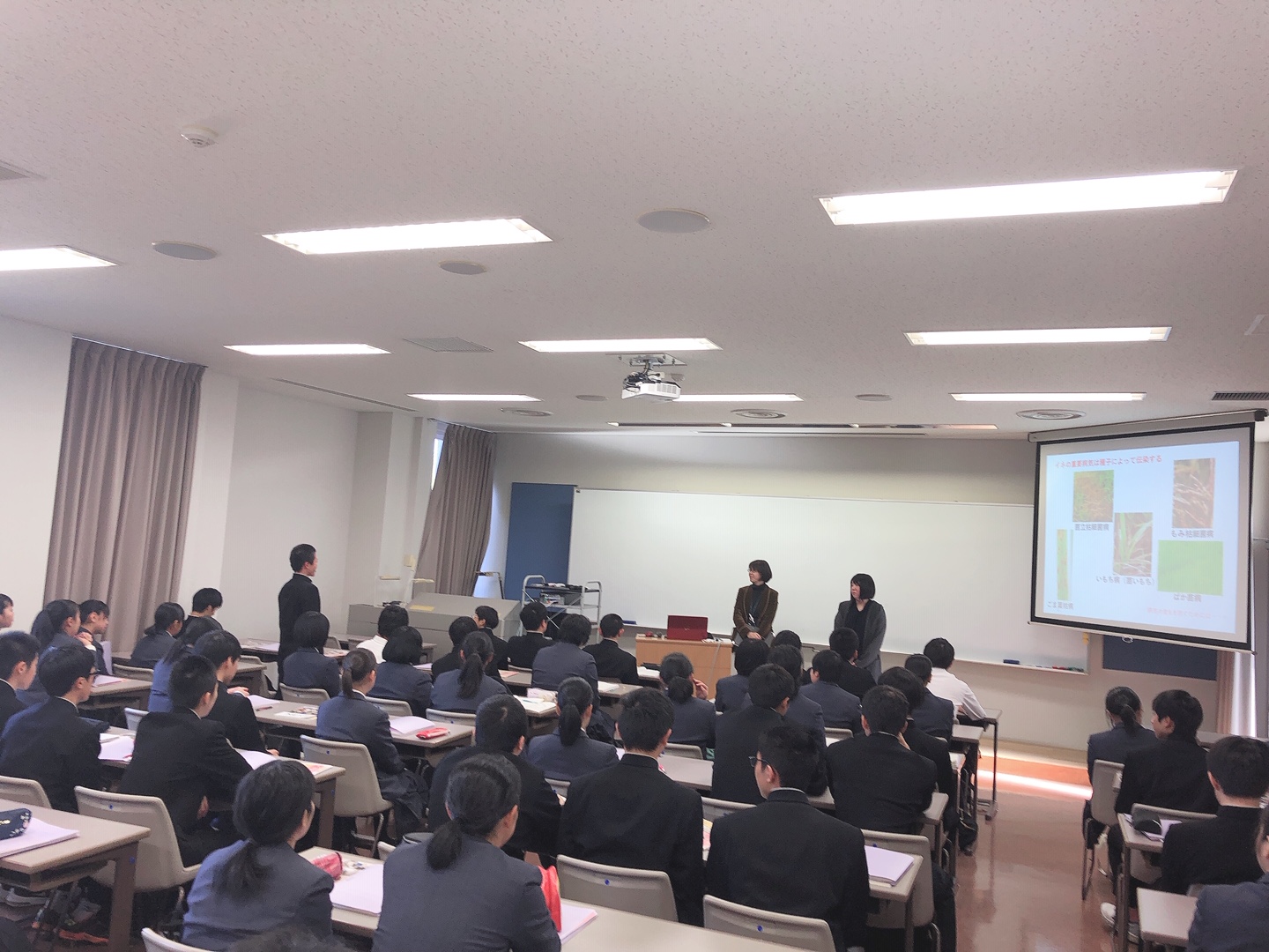 カフェテリアでの昼食後は、『学生との懇談』が行われました。農学系高校出身の学生ということで、今回は生物資源科学専攻2年の伊賀 優実さんに参加してもらいました。伊賀さんからは、「大学進学を決めた理由」や「大学での研究」、「将来の夢」などが語られました。質疑応答では「大学に入ってつらかったことはありますか?」や「難しい英単語をどのようにして覚えましたか?」、「農学系高校に入学して良かったと思ったことは何ですか?」など多くの質問が挙がり、伊賀さんの回答をうなずいて聞く生徒さんと先生方の姿がとても印象的でした。