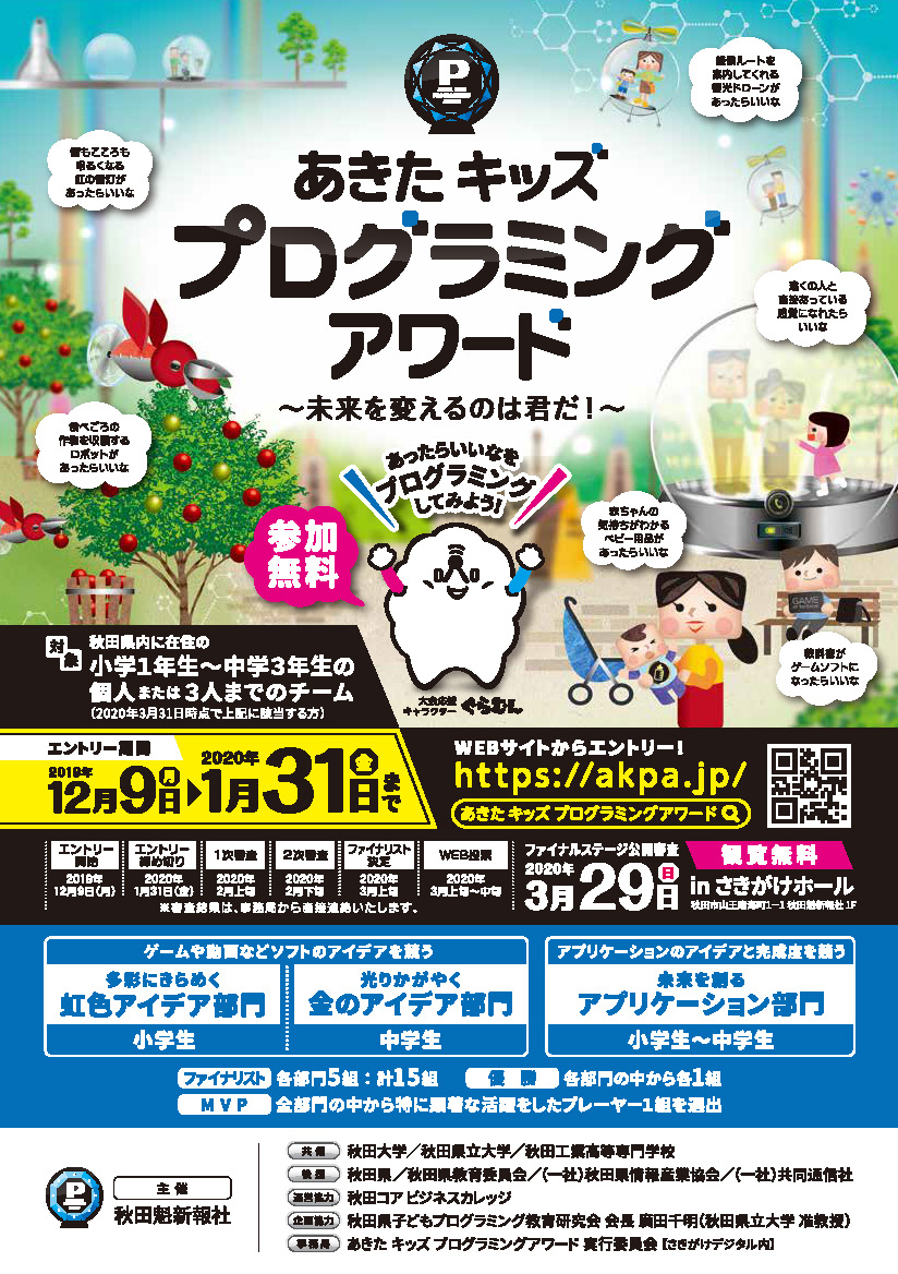 本学が共催し、システム科学技術学部の廣田千明准教授(情報工学科)が会長を務める秋田県子どもプログラミング教育研究会が企画協力する『あきたキッズプログラミングアワード ~未来を変えるのは君だ~』が開催されます。このイベントは、秋田県内在住の小・中学生を対象に、プログラミング技術やアイデアを競うコンテストで、プログラミングについての関心を高め、秋田からプログラミングに優れた人材を発掘することを目指すものです。