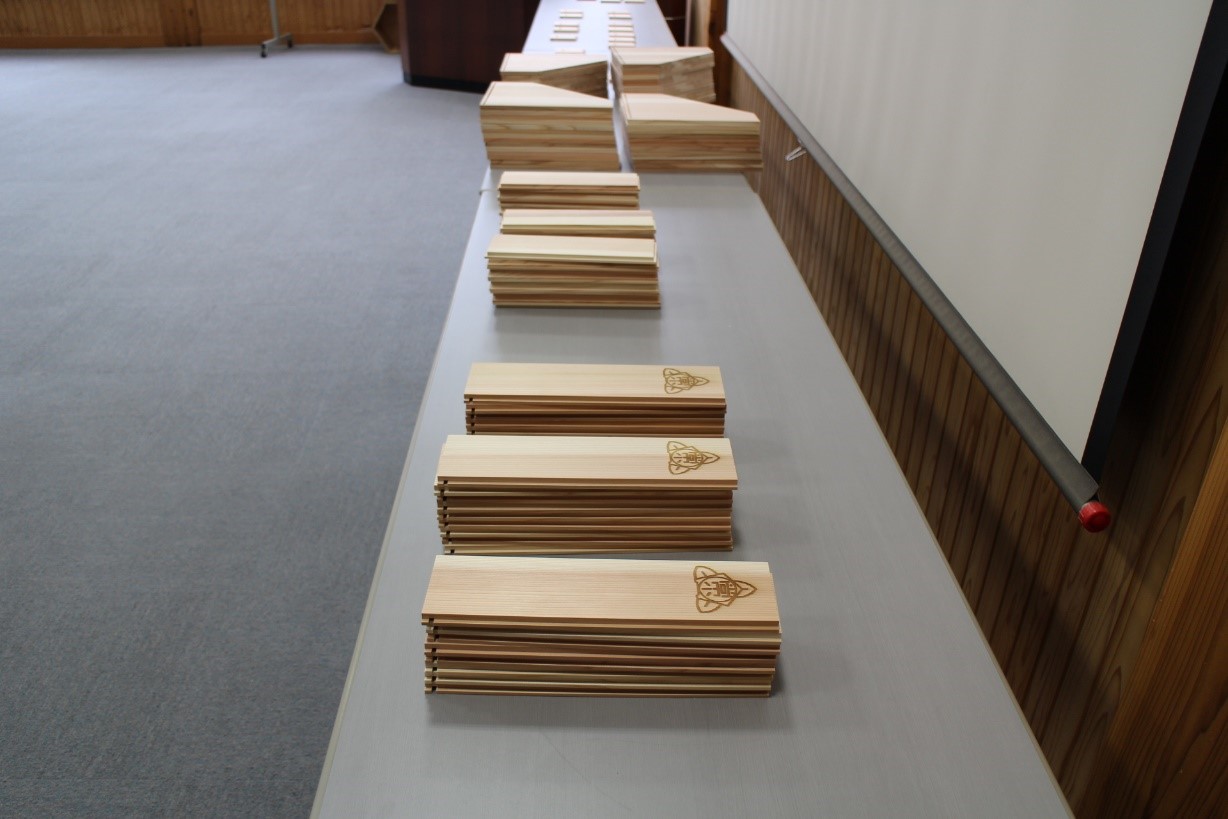 今回のファイルボックス製作は、閉校に向けた記念行事の一環として、当研究所がパーツ設計・校章印刷を行い、「能代市木の学校」がパーツを製作しました。