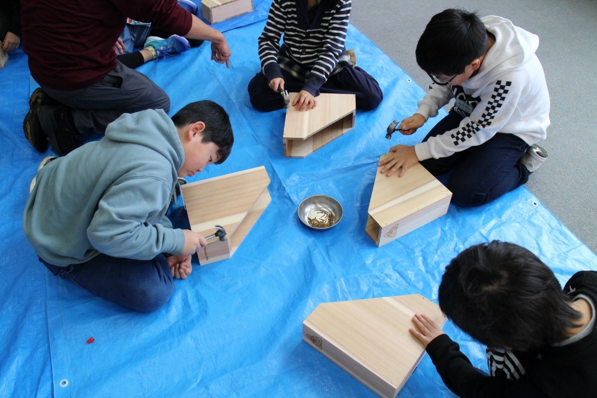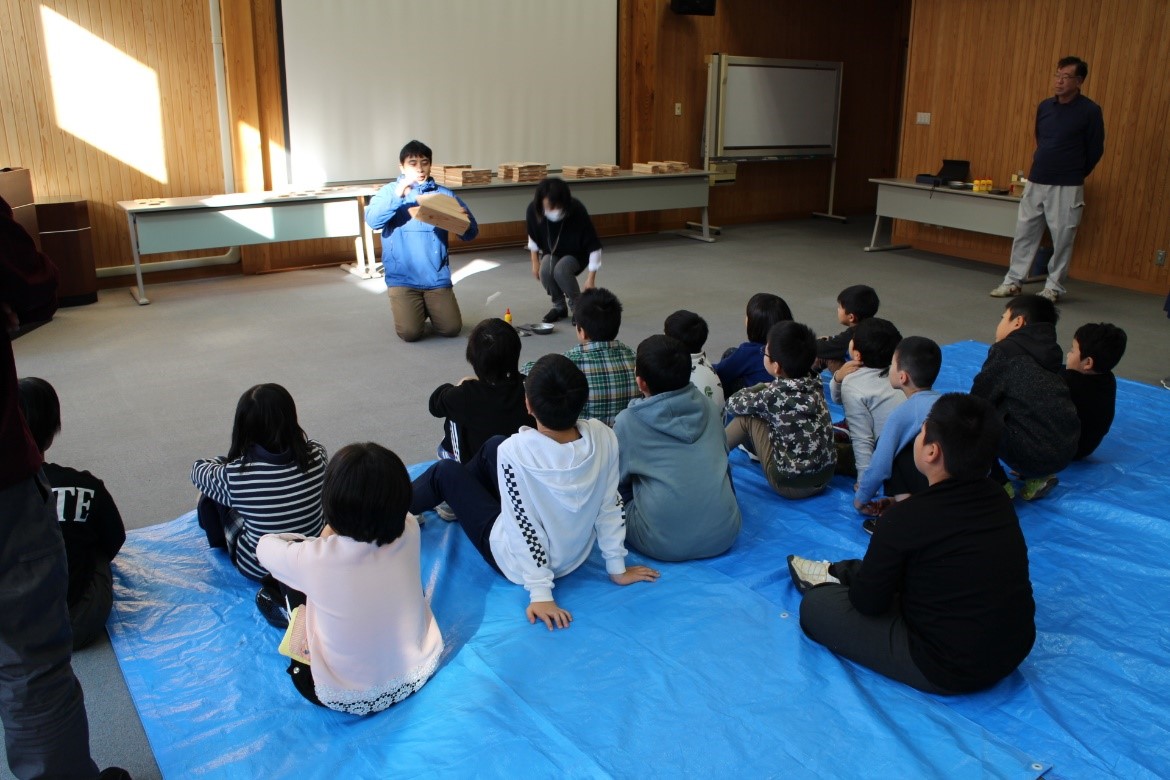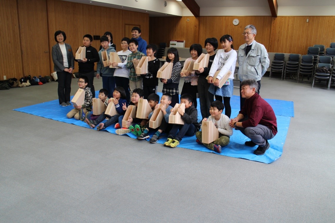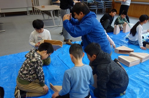 11月26日(火)能代市立常盤小学校の1年生から4年生の児童20人が、木材高度加工研究所の渡辺千明准教授・足立幸司准教授・藤嶋職員の指導のもと、"校章入り秋田杉ファイルボックスの製作"と ”木” についての学習をしました。常盤小学校は、明治8年に開設された歴史ある学校ですが、来春に朴瀬(ほのきせ)、竹生(たこう)の両小学校とともに向能代小学校に統合になります。
