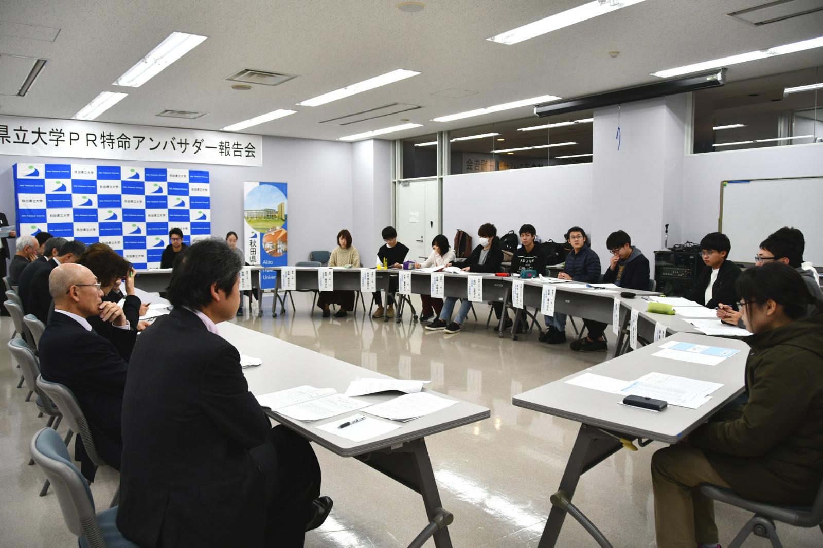 10月30日に秋田キャンパス、12月2日に本荘キャンパスにおいて、令和元年度「秋田県立大学PR特命アンバサダー」の報告会を行いました。今年度は総勢49名(秋田キャンパス26名・本荘キャンパス23名)の学生さんが母校を訪問しました。報告会では、その活動内容が報告され、学生たちのいろいろなスタイルでのPR方法に、小林学長からは感心した様子で「本当によくやってくれていますね。」と労いの言葉がかけられました。