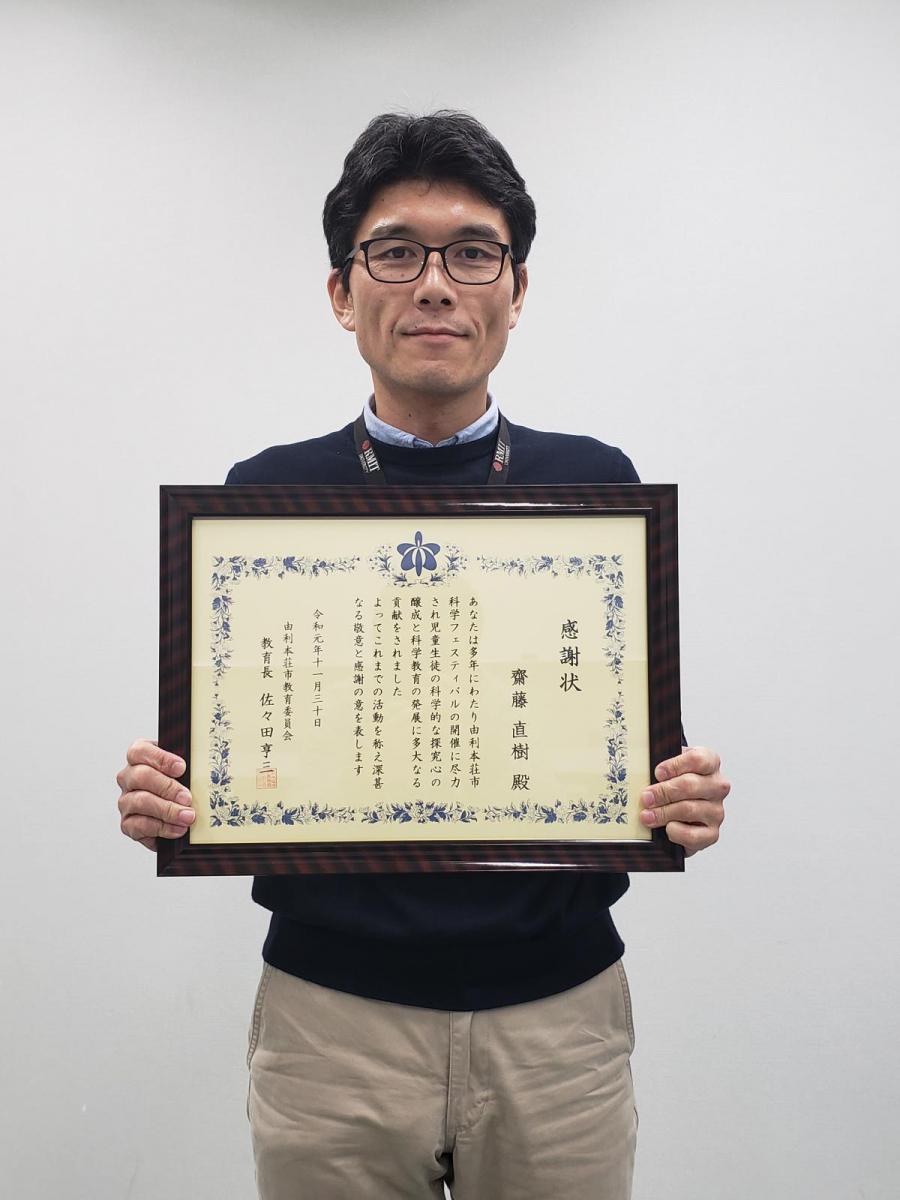 11月30日(土)に開催された第16回科学フェスティバル(由利本荘市教育委員会主催)において、本学の協力に対して感謝状が送られました。科学フェスティバルに対しては、本学共催事業として、本荘キャンパス創造工房が取りまとめ、例年本学教員および学生による出展を行っています。今回は創造工房委員として学内参加の取りまとめや運営協力を長年行ってきた齋藤直樹准教授あてに感謝状をいただきました。
