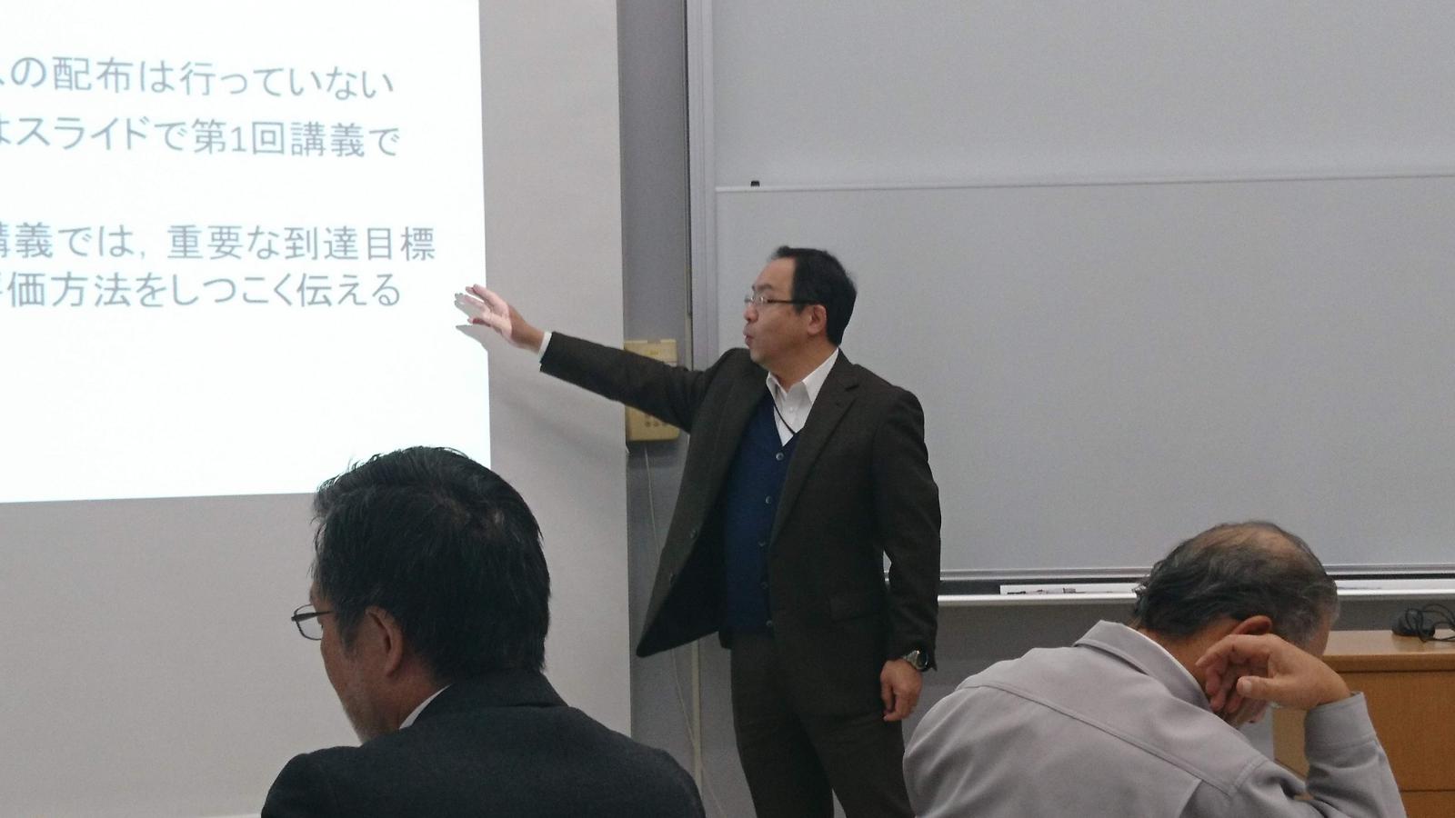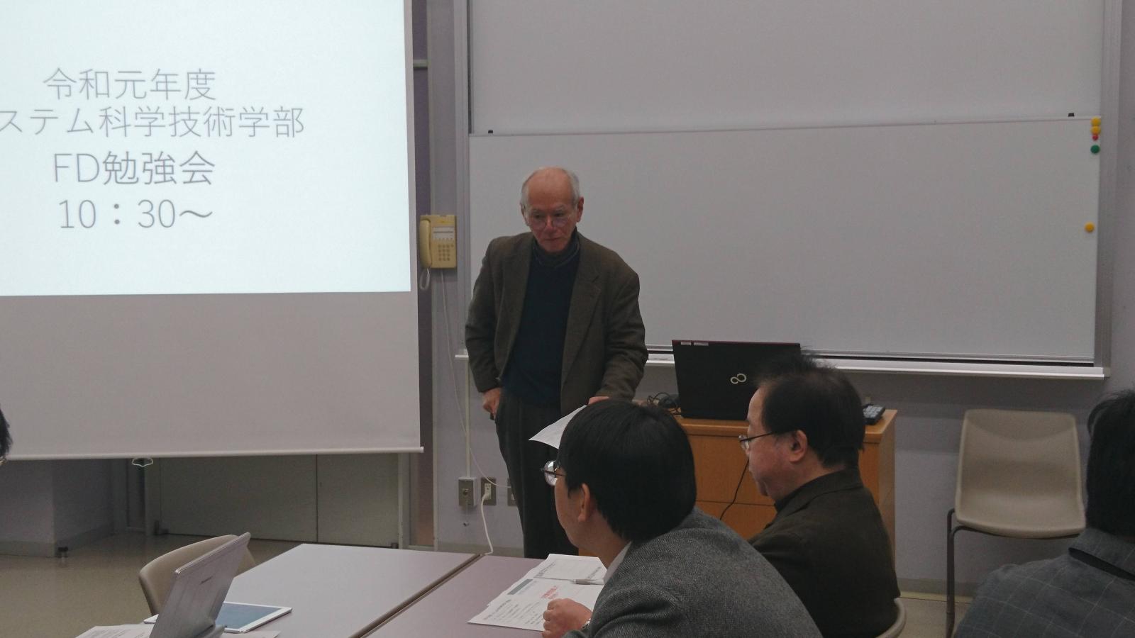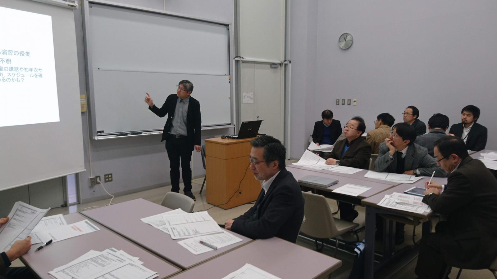 2019年12月10日に本荘キャンパスにてFD勉強会を開催しました。FD専門部会システム科学技術分会では今年のFD活動のテーマとしてシラバスの活用を掲げており、「シラバスの有効利用を考える」と題して勉強会を開催しました。松本学部長の挨拶のあと、総合科学教育センターの伊藤大輔准教授から、趣旨説明がありました。授業アンケートの項目「シラバスは授業の学修の役に立っていますか」について分析した結果、昨年度から今年度にかけて、大幅に改善がみられたことが説明されました。また、残された問題として、受動的な学生への指導があり、初年次教育や授業運営に工夫が望まれていることが説明されました。