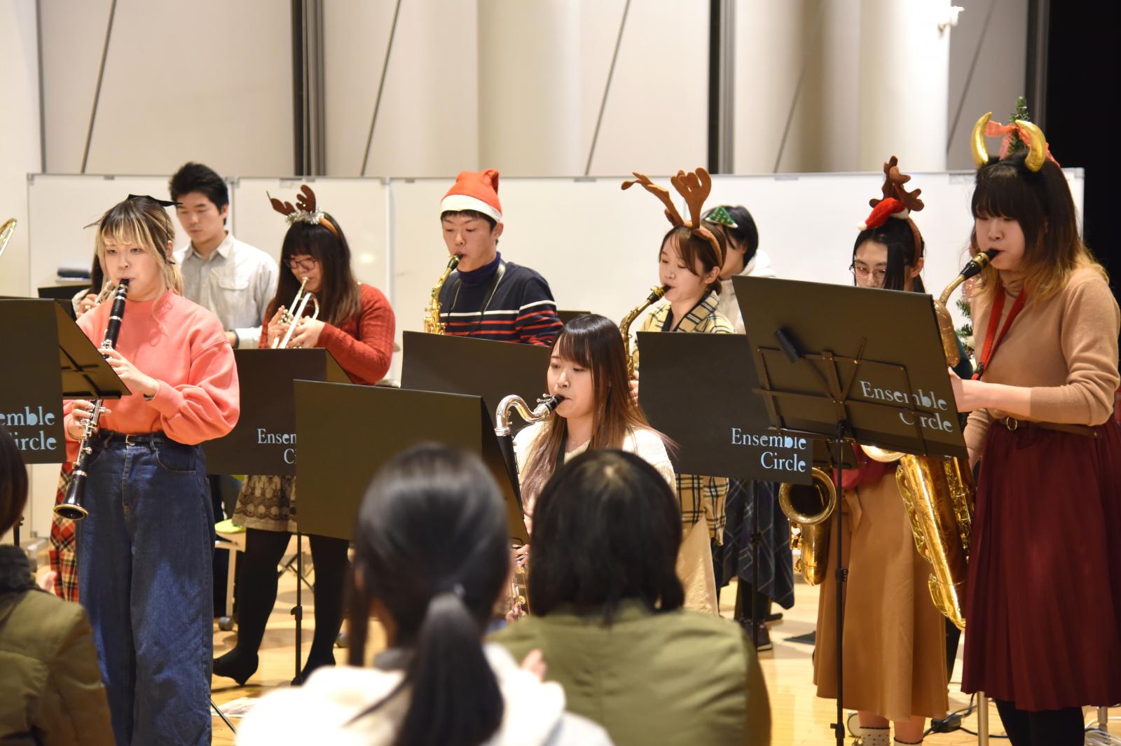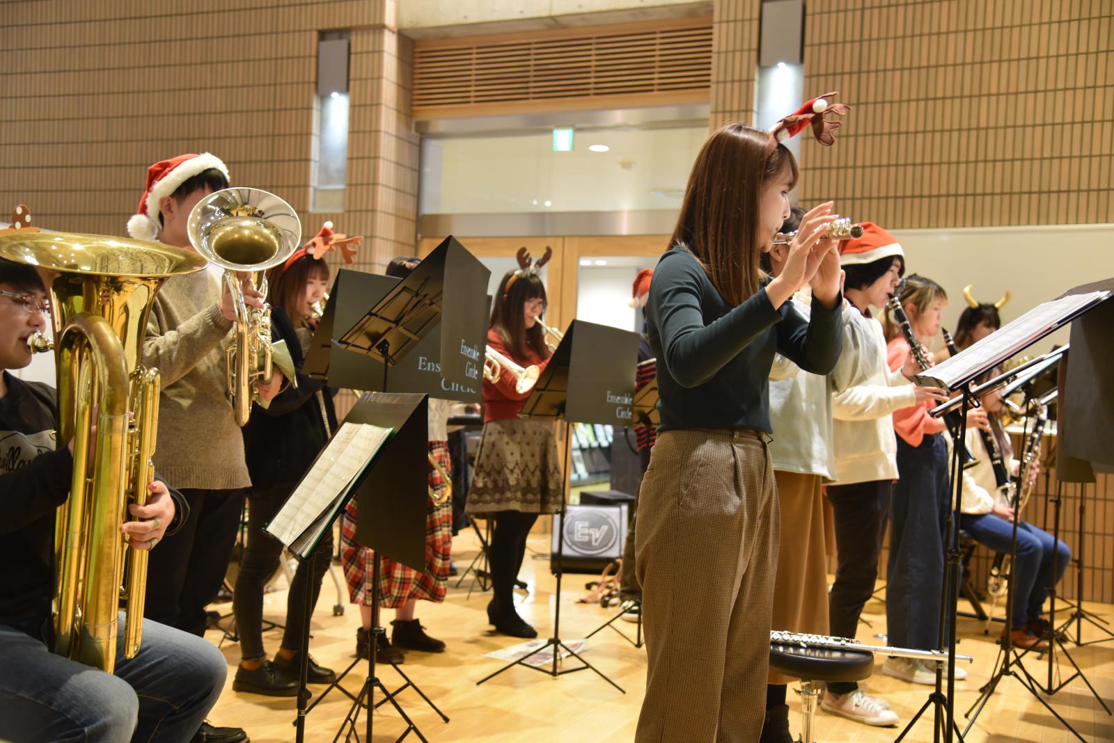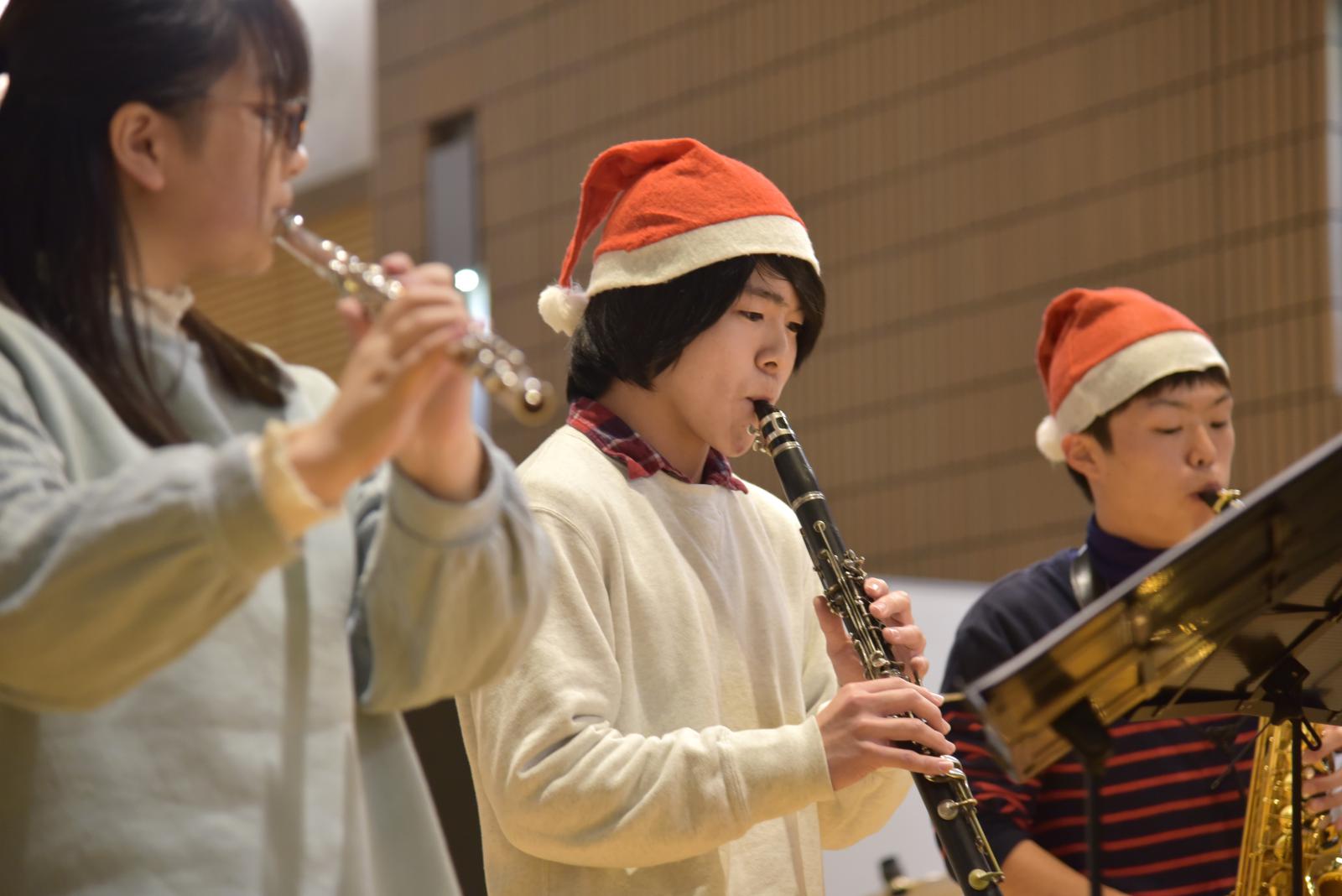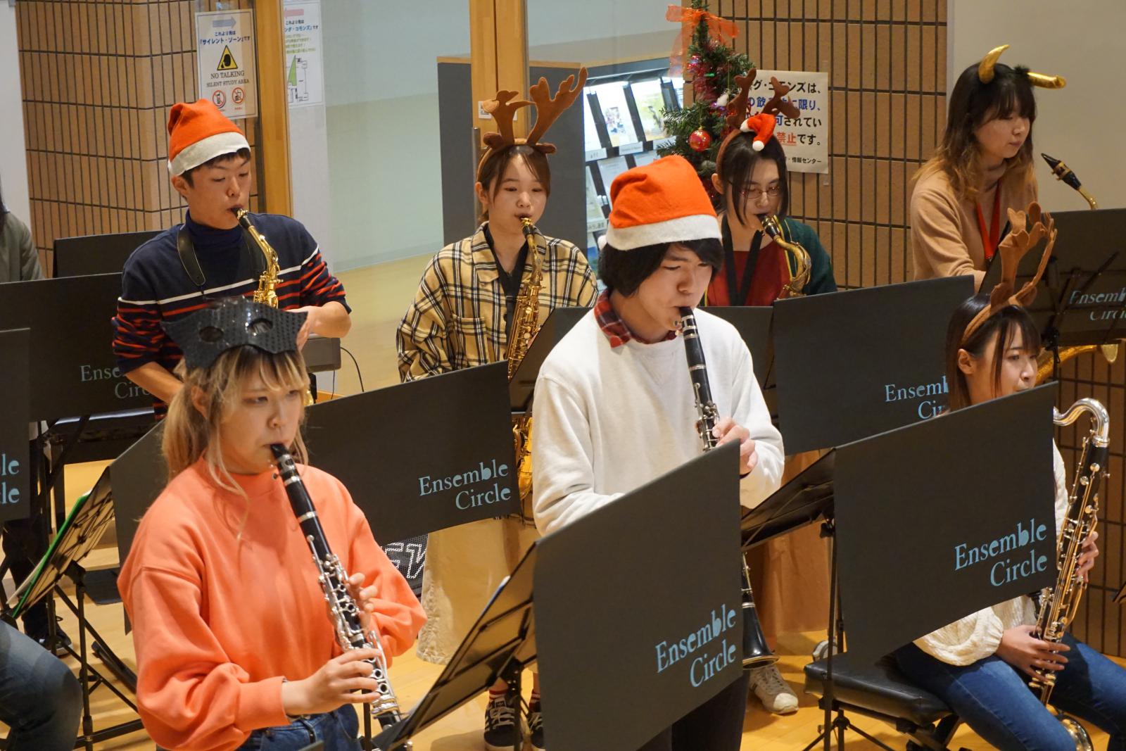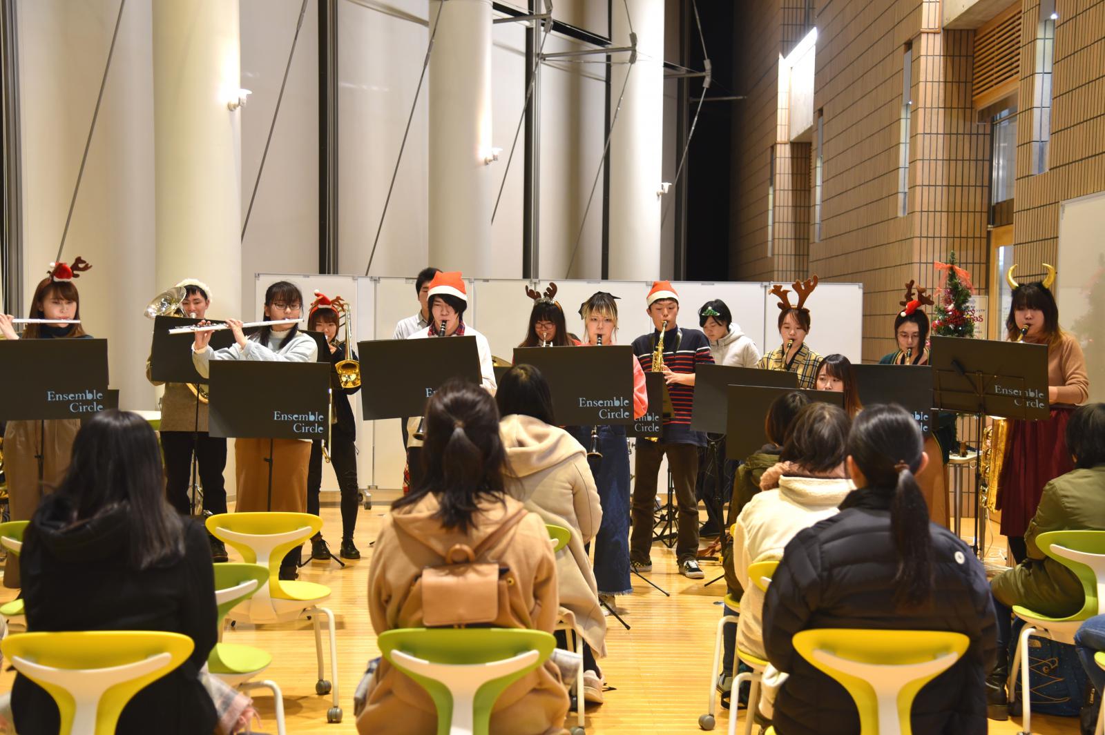 12月23日、秋田キャンパス図書館(ラーニングコモンズ)において、クリスマス企画として、アンサンブルサークル(代表:最上華帆さん[生物環境科学科2年]、顧問:川上 寛子 助教[生物生産科学科])による「Christmas Concert」が開催されました。コンサートではクリスマスソングの名曲のほか、ピタゴラスイッチのオープニングテーマ曲など十数曲を演奏いただきました。図書館(ラーニングコモンズ)におけるコンサートは昨年に引き続き2回目の開催でしたが、開放的な空間全体に美しいアンサンブルの音色が響き渡り、参加した学生や教職員が一足早いクリスマス気分を味わいました。