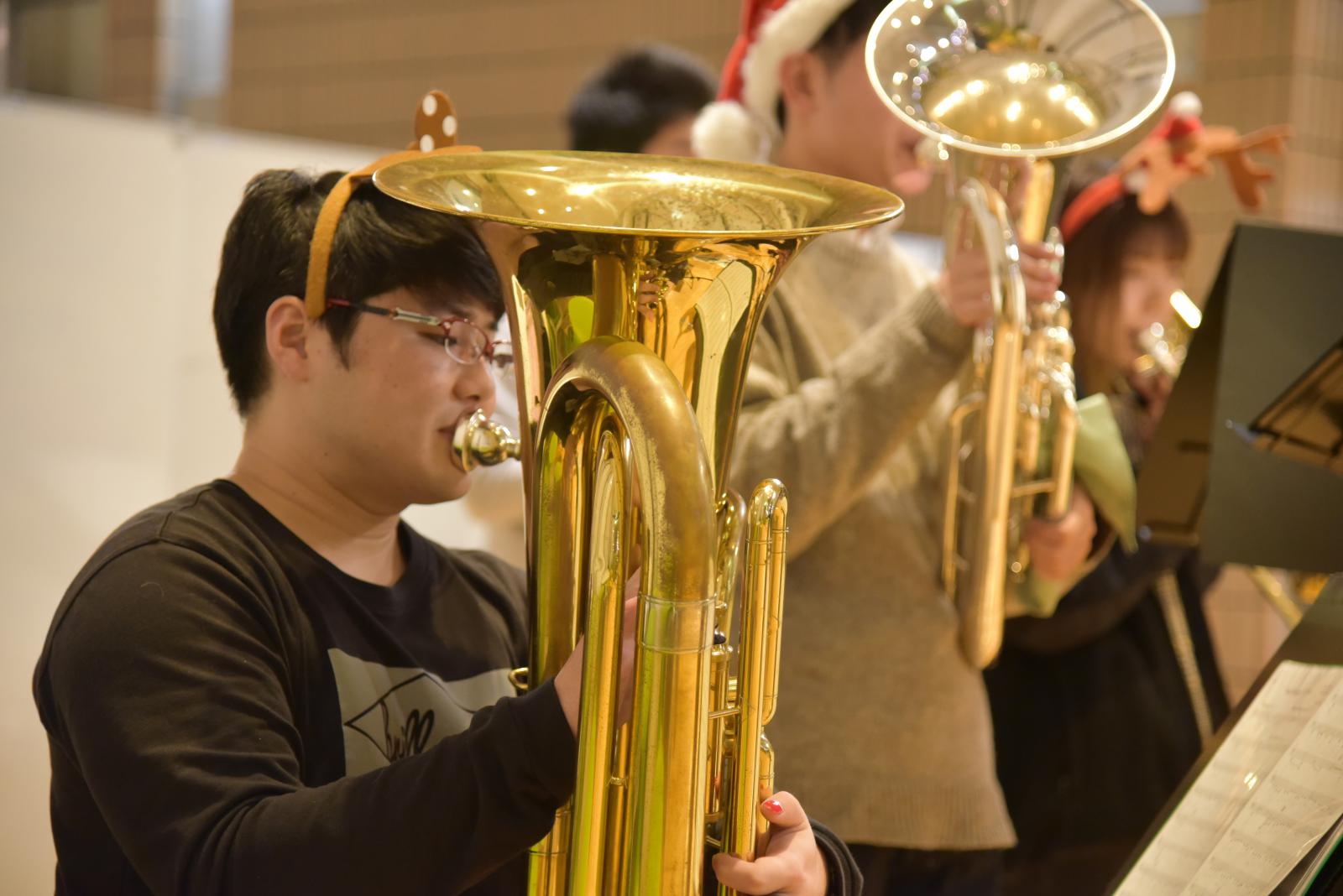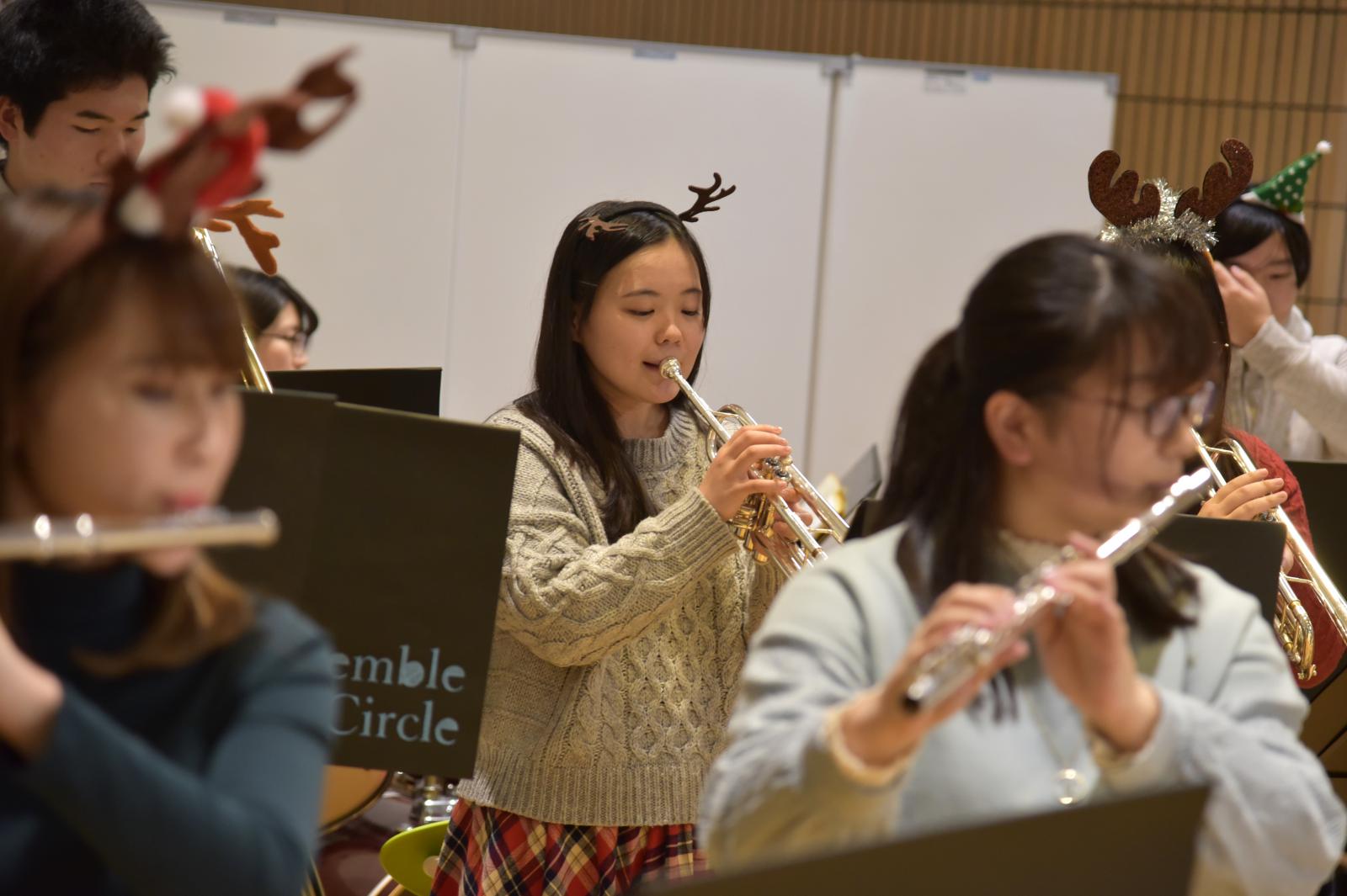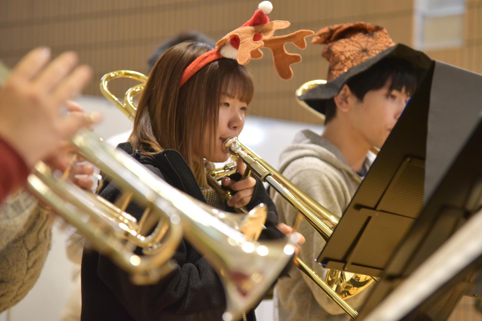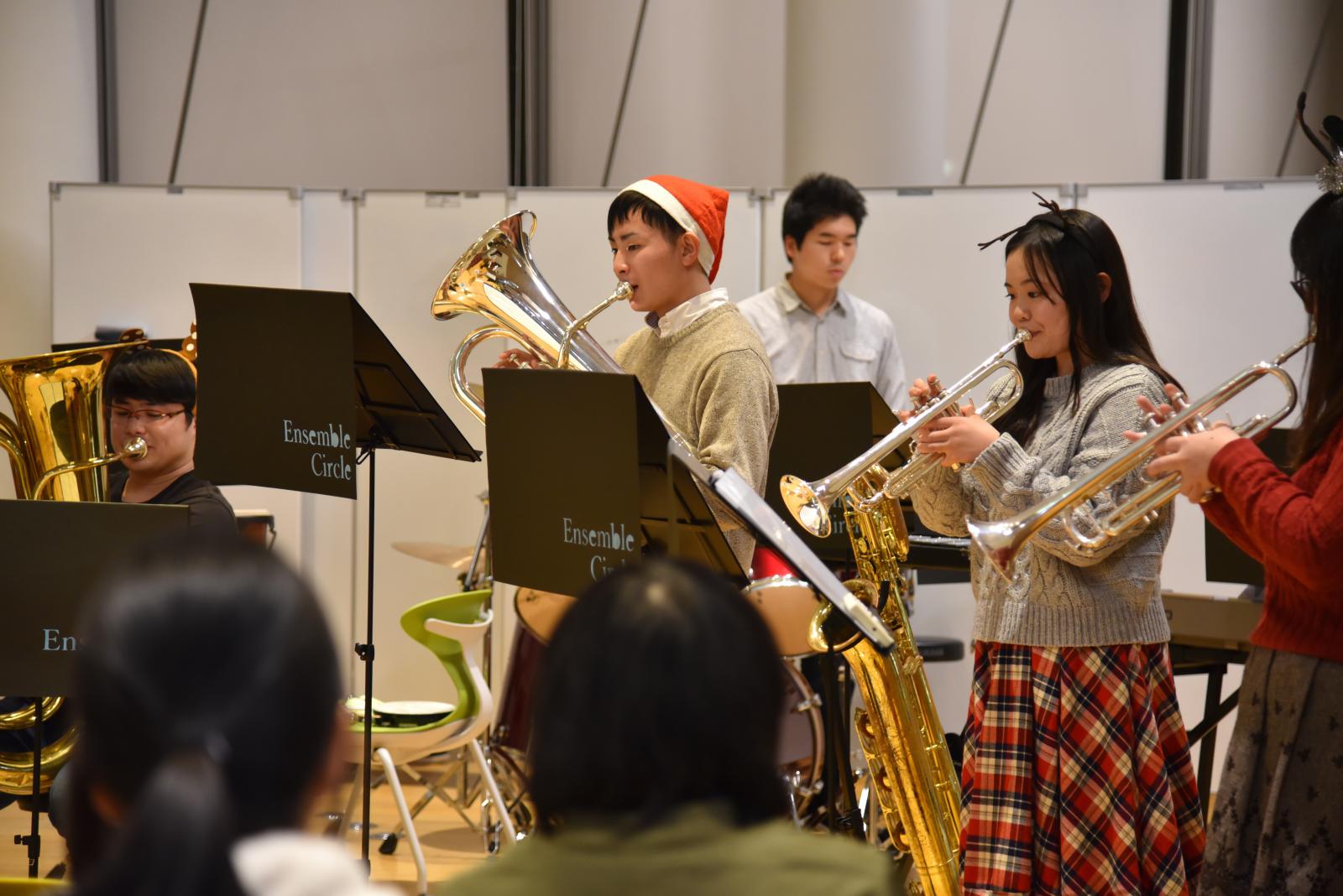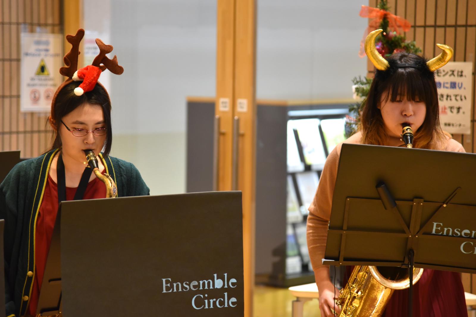 12月23日、秋田キャンパス図書館(ラーニングコモンズ)において、クリスマス企画として、アンサンブルサークル(代表:最上華帆さん[生物環境科学科2年]、顧問:川上 寛子 助教[生物生産科学科])による「Christmas Concert」が開催されました。コンサートではクリスマスソングの名曲のほか、ピタゴラスイッチのオープニングテーマ曲など十数曲を演奏いただきました。図書館(ラーニングコモンズ)におけるコンサートは昨年に引き続き2回目の開催でしたが、開放的な空間全体に美しいアンサンブルの音色が響き渡り、参加した学生や教職員が一足早いクリスマス気分を味わいました。
