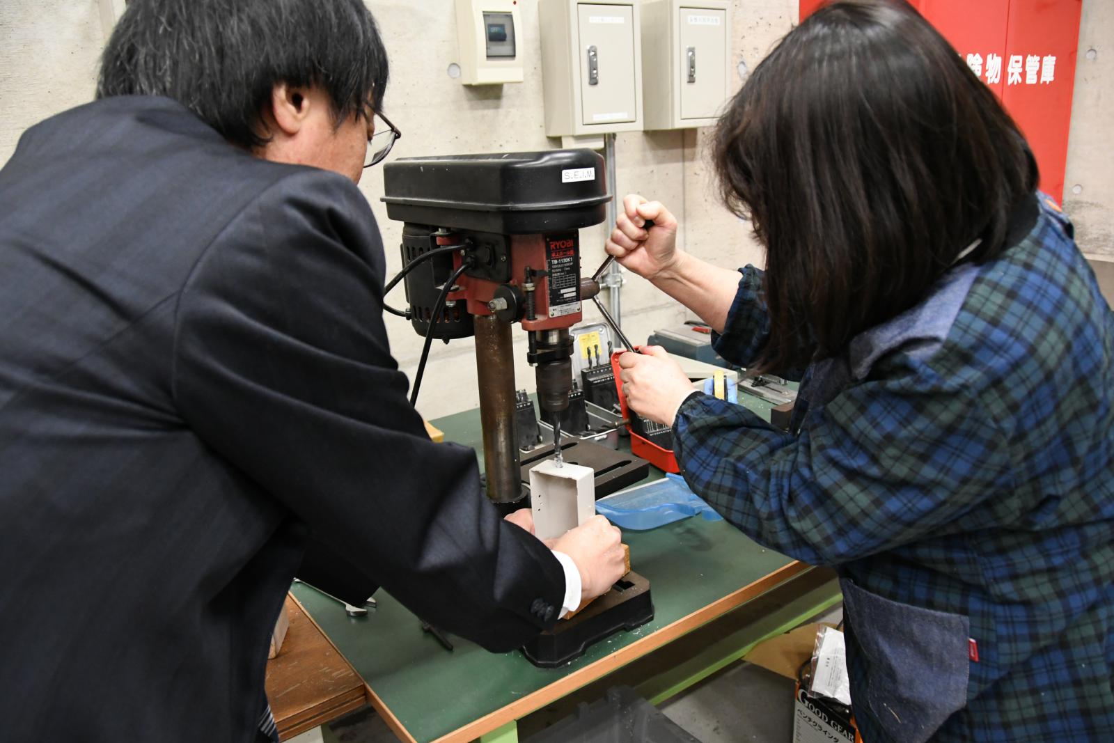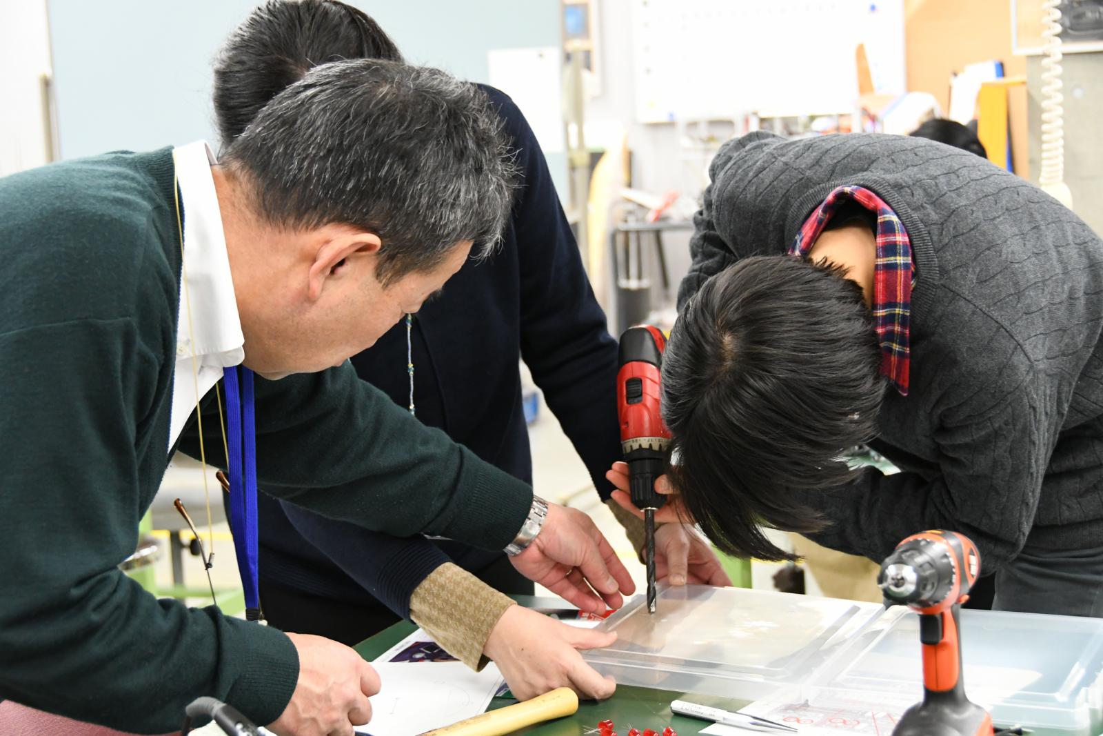 令和元年12月26日、本荘キャンパス創造工房にて、ゆり支援学校道川分教室の教員を対象とした教材・教具研修会(後期)を開催しました。この研修会は例年、本荘キャンパス創造工房を利用して、夏休み(前期)、冬休み(後期)の全2回開催しているもので、システム科学技術学部知能メカトロニクス学科の高山正和准教授が講師を務めています。研修では、はんだ付けやボール盤による穴あけ加工などの基本的な技術を学び、実際に支援学校で使用する教材・教具を製作します。