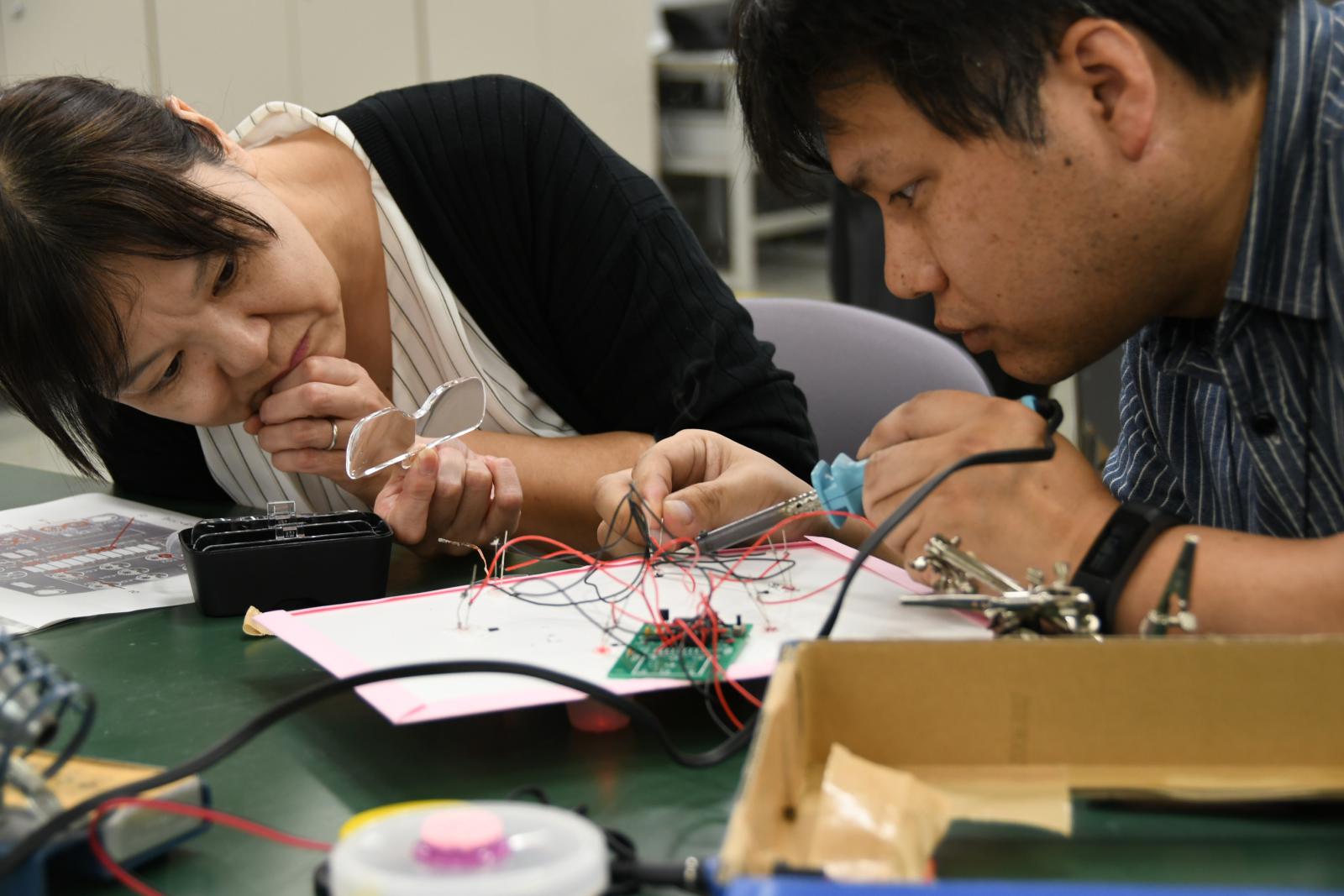 製作にあたっては皆さん慣れないはんだ付けに苦戦しつつ、協力し合いながら作業をされていました。昨年度や前期の研修で同じ教材・教具を製作した方も参加されていて、今回初めて製作される方をサポートしながら進められていました。