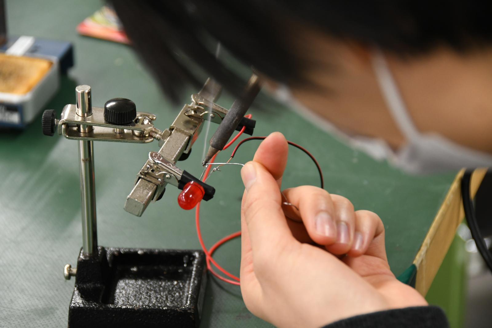 今回の研修会では、スイッチを押すとLEDが順番に点灯してルーレットを行うものと、同じくスイッチを押すと小さい棒が飛び出し前の物体に当たって音を立てるものの2種類の製作を行いました。また、一部のグループではこれまでの講習で製作した教材・教具の修理を担当しました。