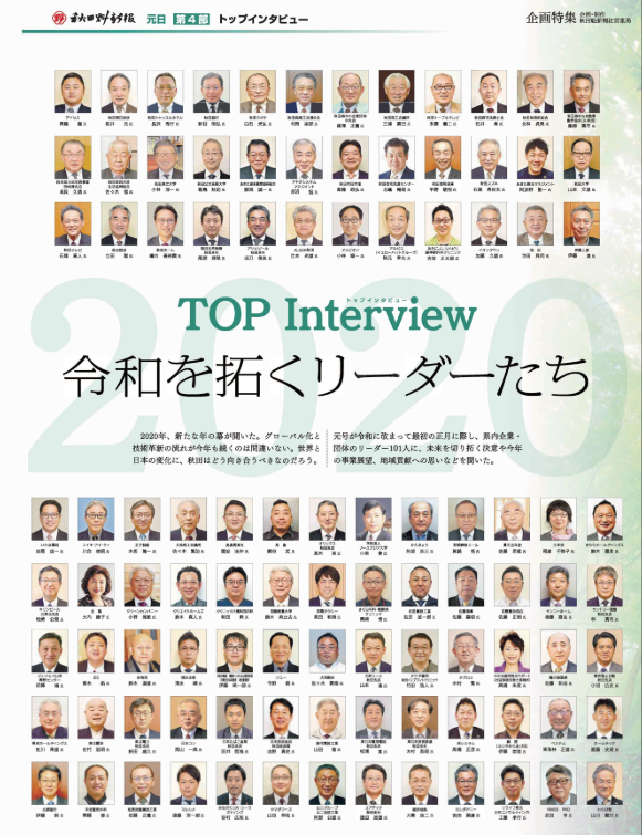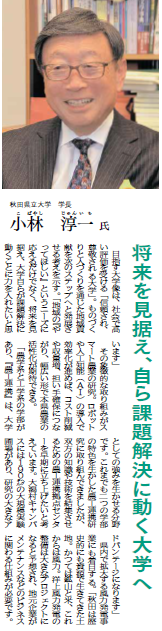 秋田魁新報「トップインタビュー」に小林学長のインタビュー記事が掲載されました 2020年1月1日付けの、秋田魁新報「TOP INTERVIEW 令和を拓くリーダーたち」において、小林淳一学長のインタビュー記事が掲載されました。 内容は秋田魁新報電子版からもご覧いただけますので、是非ご覧ください。 秋田魁新報電子版 小林学長のインタビュー記事