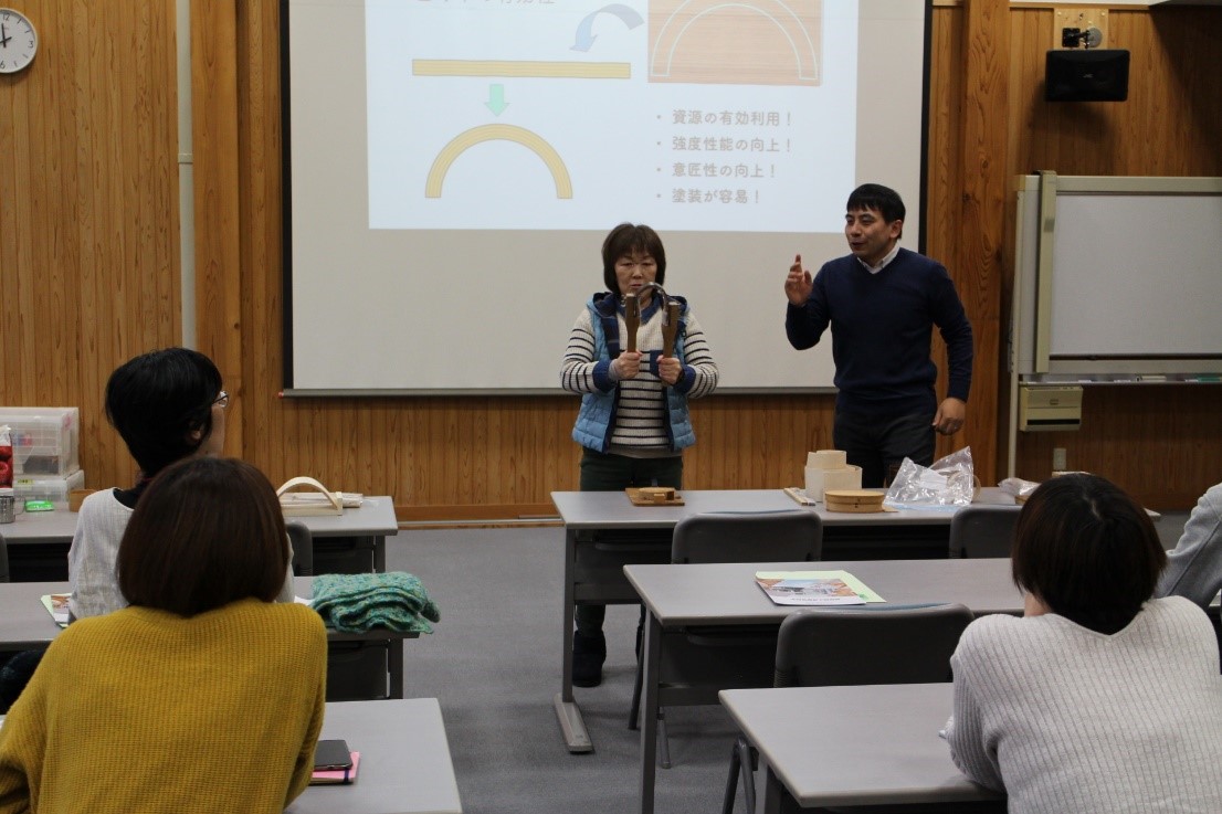 最後に、木を曲げる原理の説明と実演を行いました。木に対する知識や関心の高い皆様ですが、加熱により人の力で簡単に曲がるのことや、水に浸けた木の形が変化することを目にすると驚きの声があがりました。