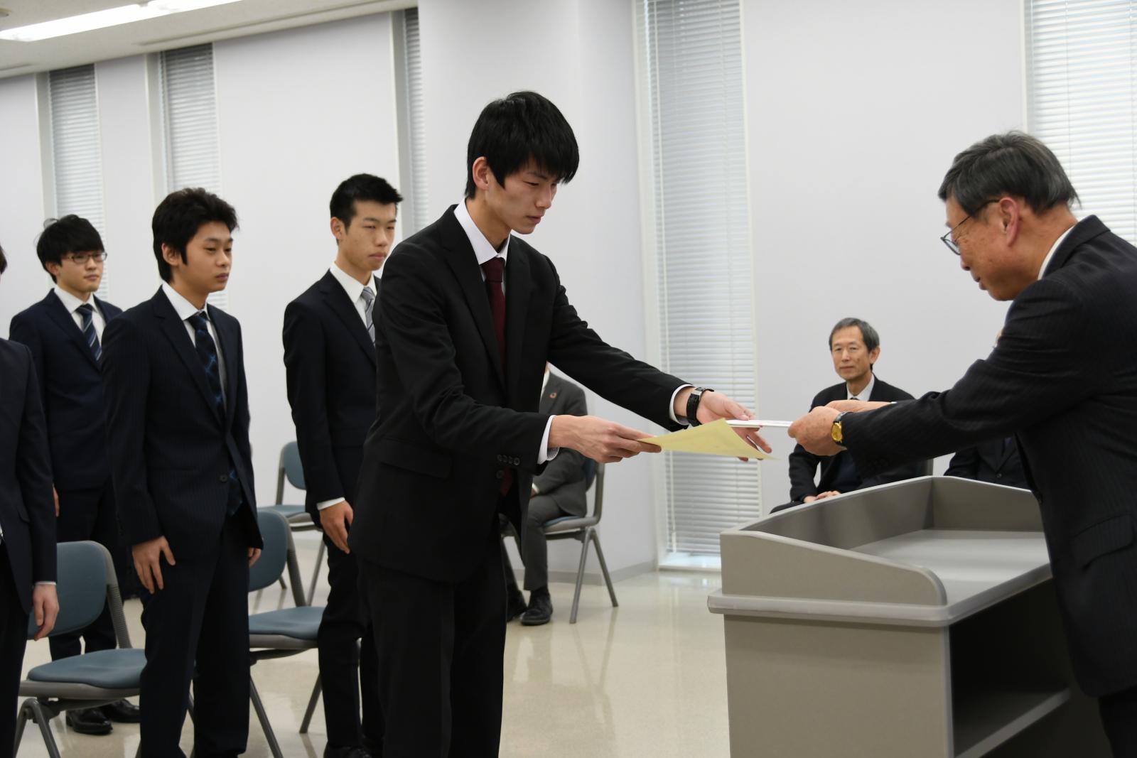 表彰式では、学長よりお祝いの言葉と、「結果に至るプロセスが大事。今回の様に仲間と試行錯誤し、良い結果を生み出した経験を活かし社会で活躍していってほしい。」とのコメントがありました。