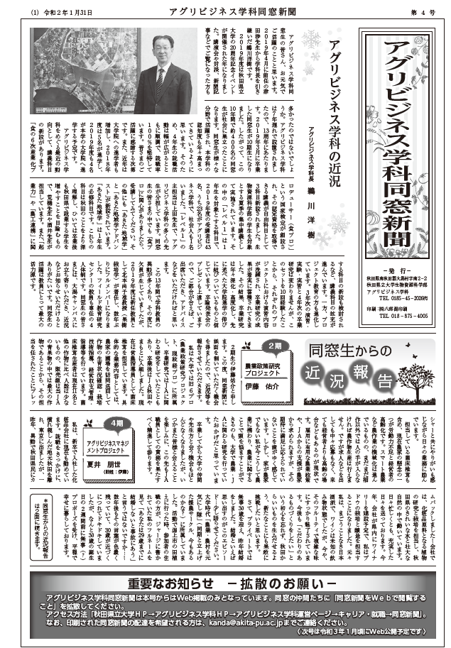 アグリビジネス学科では、今後、本学と卒業生、および卒業生同士のネットワーク構築に、同窓新聞を役立てていきたいと考えています。