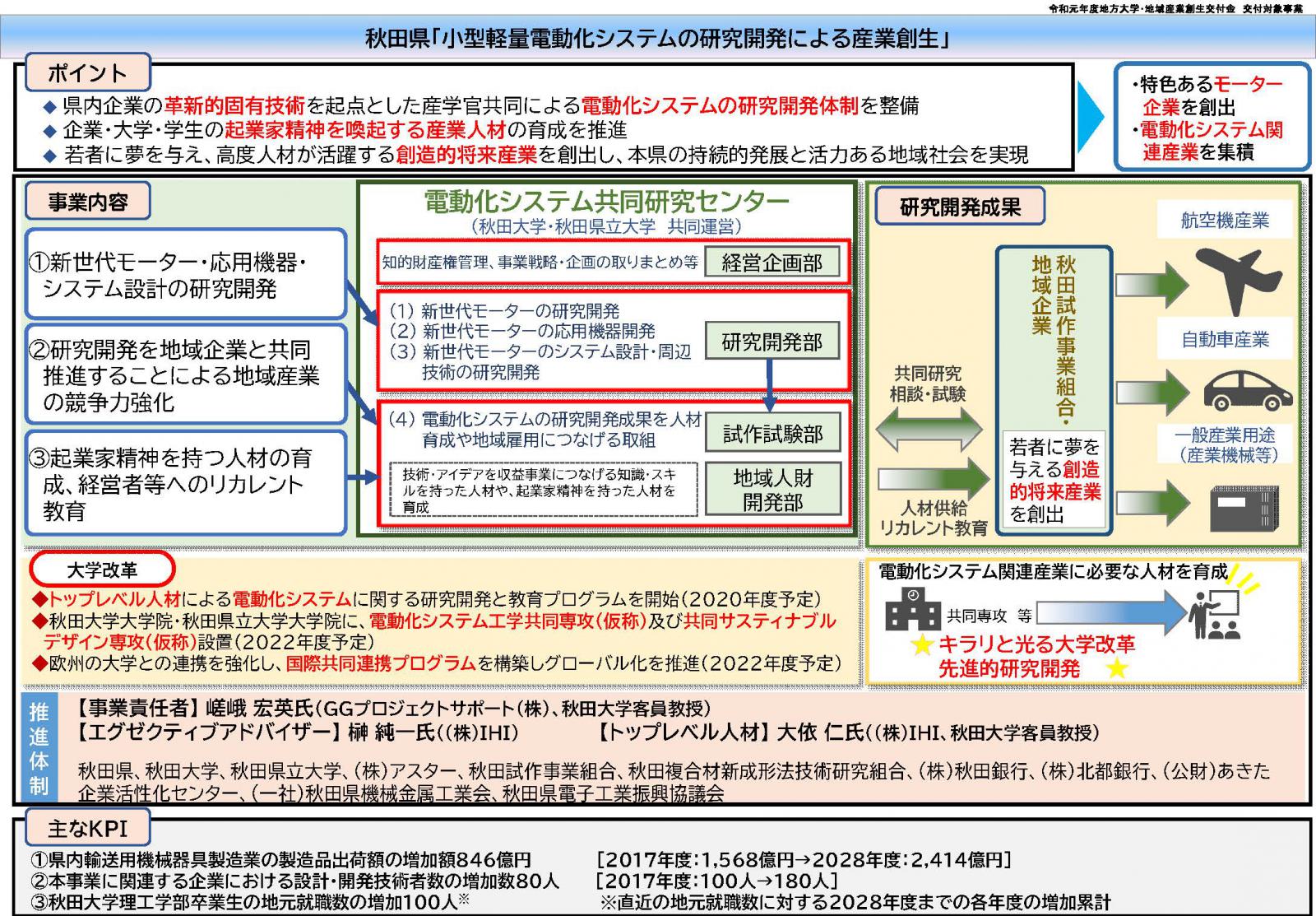 地方大学・地域産業創生交付金に関する計画が認定されました このたび、秋田大学や本学などが参画し、秋田県が申請していた地方大学・地域産業創生交付金に関する計画「小型軽量電動化システムの研究開発による産業創生」が、令和2年1月31日付けで内閣総理大臣により認定されました。 本学は知事のリーダーシップの下で、秋田大学などの推進機関と連携し、地域の産業振興支援や産業人材育成などの事業に取り組んでまいります。 計画概要については下のPDFファイルをご覧ください。 ※クリックするとPDFが開きます 関連リンク 内閣府プレスリリース 地域における大学振興・若者雇用創出事業に関する計画の認定について 秋田県プレスリリース 秋田大学プレスリリース