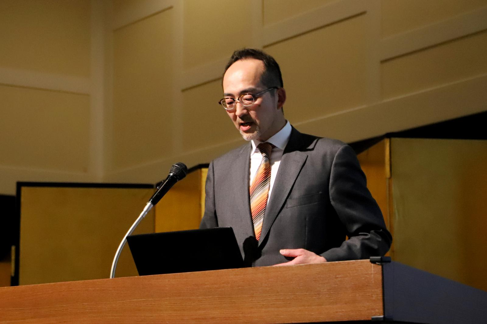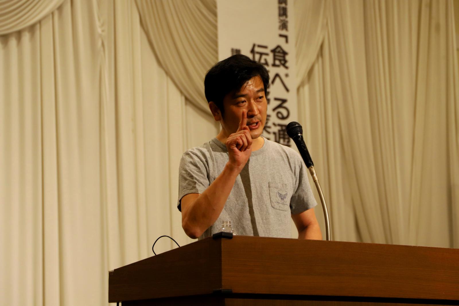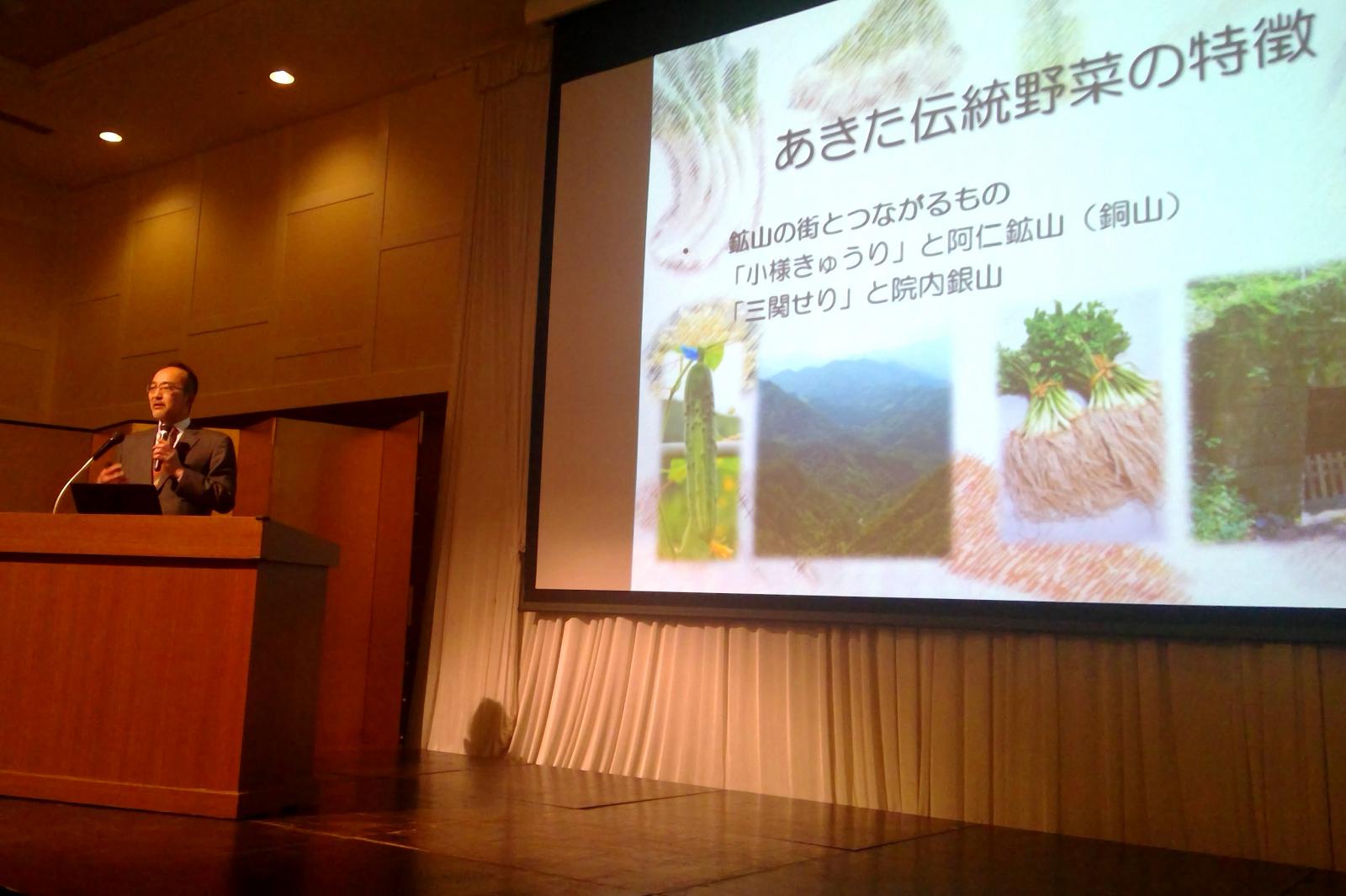 続いて、生物資源科学部の櫻井健二准教授(生物生産科学科)による秋田の伝統野菜と発酵文化の紹介、一般社団法人 日本食べる通信リーグ代表理事の高橋博之さんによる基調講演が行われました。高橋さんからは、「伝統野菜を伝える意味について」と題し、経済性や効率だけでは測れない地方や伝統野菜の価値について語られ、多くの参加者に強く訴える内容でした。