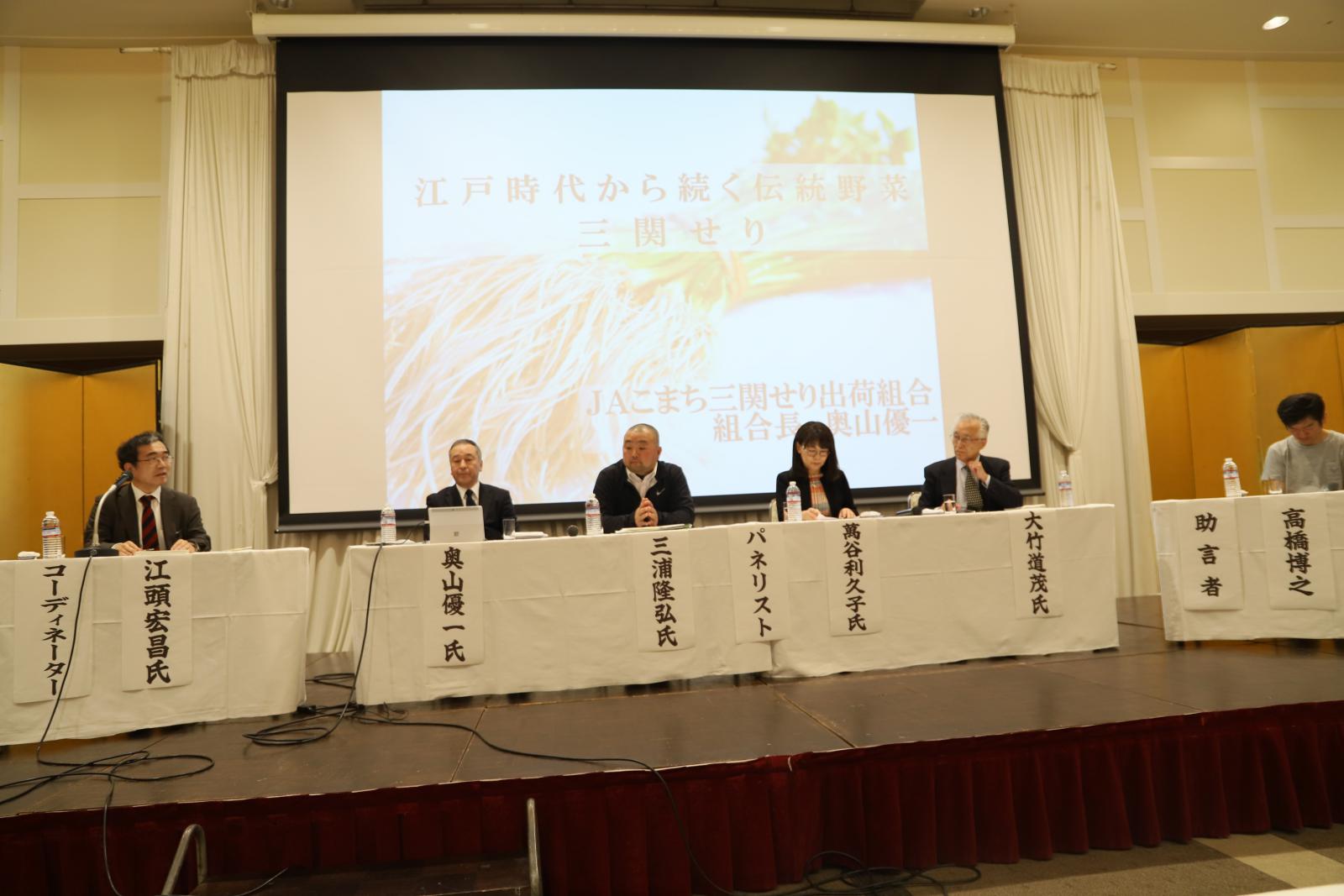 引き続き、湯沢市の三関せり生産組合代表奥山優一氏をはじめ、生産者や伝統野菜普及団体の方々とのパネルディスカッションが行われ、保全活動について全国の事例が紹介されました。
