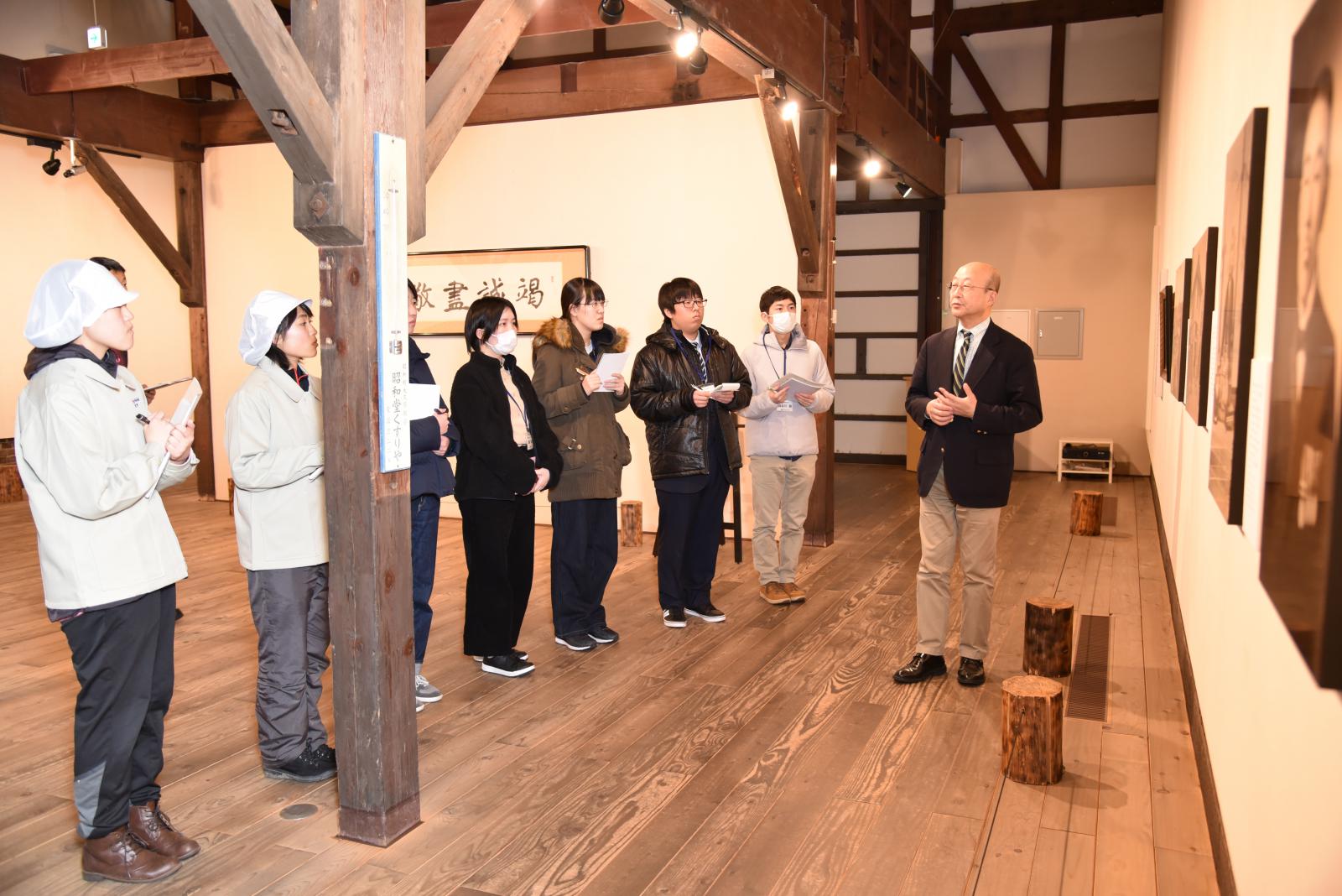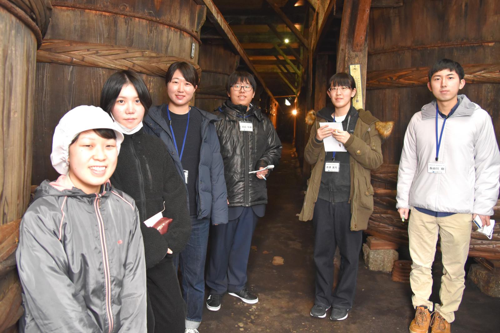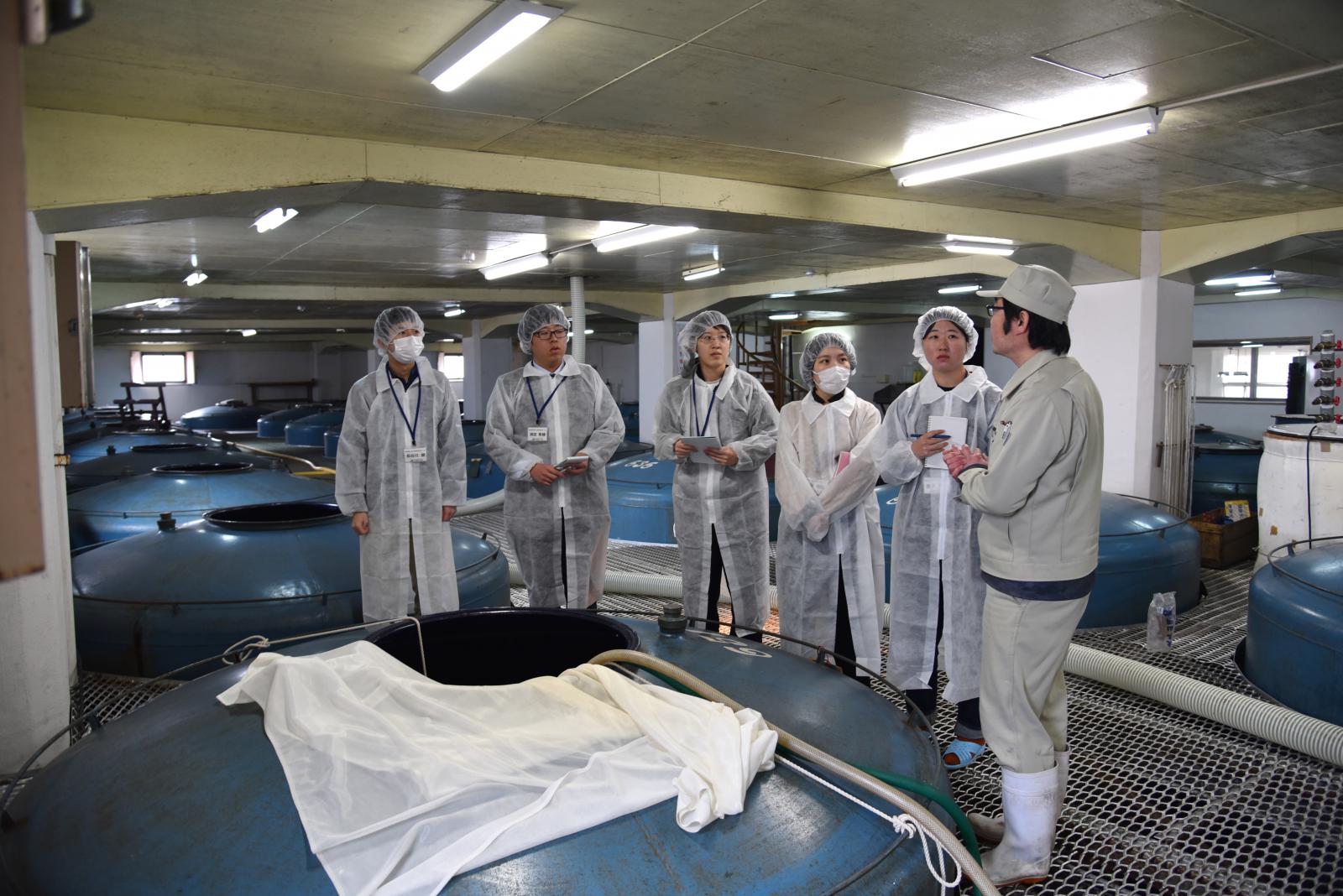 本学では、学生の県内企業に対する理解促進、早期の職業観・勤労観の形成、及び学生の県内企業への就職・県内定着を促進することを目的に、学部1・2年次生を対象に、職場観察型一日インターンシップ、「ジョブシャドウイング(Job Shadowing)」を実施しています。2月21日(金)、小玉醸造株式会社のご協力をいただき、生物資源科学部の学生5名が参加しジョブシャドウイングを実施しました。小玉醸造株式会社は、秋田を代表する味噌・醤油と清酒の醸造元です。明治12年、味噌・醤油の醸造業として創業し、「ヤマキウ」の秋田味噌は県内一の生産量を誇ります。大正2年には、酒造業も始め、「清酒太平山」は全国清酒鑑評会などで数多くの金賞を受賞しており、秋田県を代表する蔵元の一つです。従業員は55名、本学の卒業生では大学院卒の1名が在職しています。