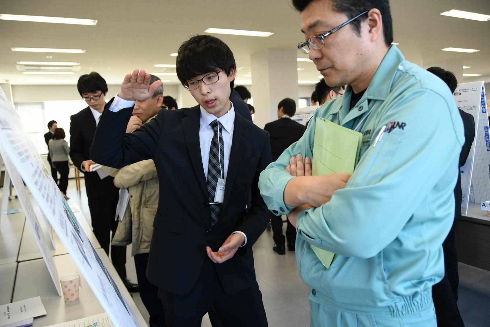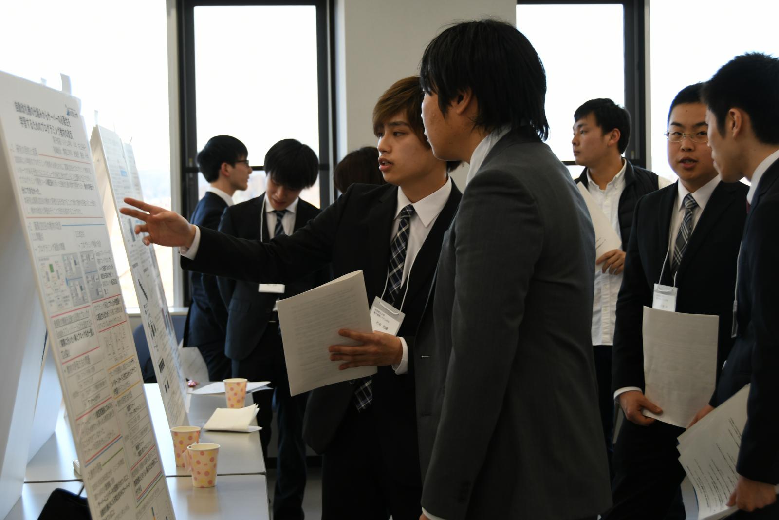 令和2年2月20日、本荘由利テクノネットワークによる【学生×企業】事業として、本学学生による学生パネル発表を実施しました。本荘由利テクノネットワークは秋田県本荘・由利地域の産業界の活発化を目指し設立されたもので、本学も会員として参加しています。このイベントは本学の学部4年生~院1年生の学生計47名が、来場した企業の方などに向け、自身の研究テーマについてパネル発表を行うものです。発表者は2グループに分かれ、1時間ごとのコアタイムを設けて発表を行いました。当日は企業等学外の方41名、学内者(教員や学生)119名の参加があり、またコアタイム外の発表者が他の人の発表を聞きに行くなどして、積極的に交流している様子が見られました。特に学内者の参加については、教員・学生ともに他学科の発表を聞きに行っている姿も多く、学科の垣根を超えた交流の場になったようでした。