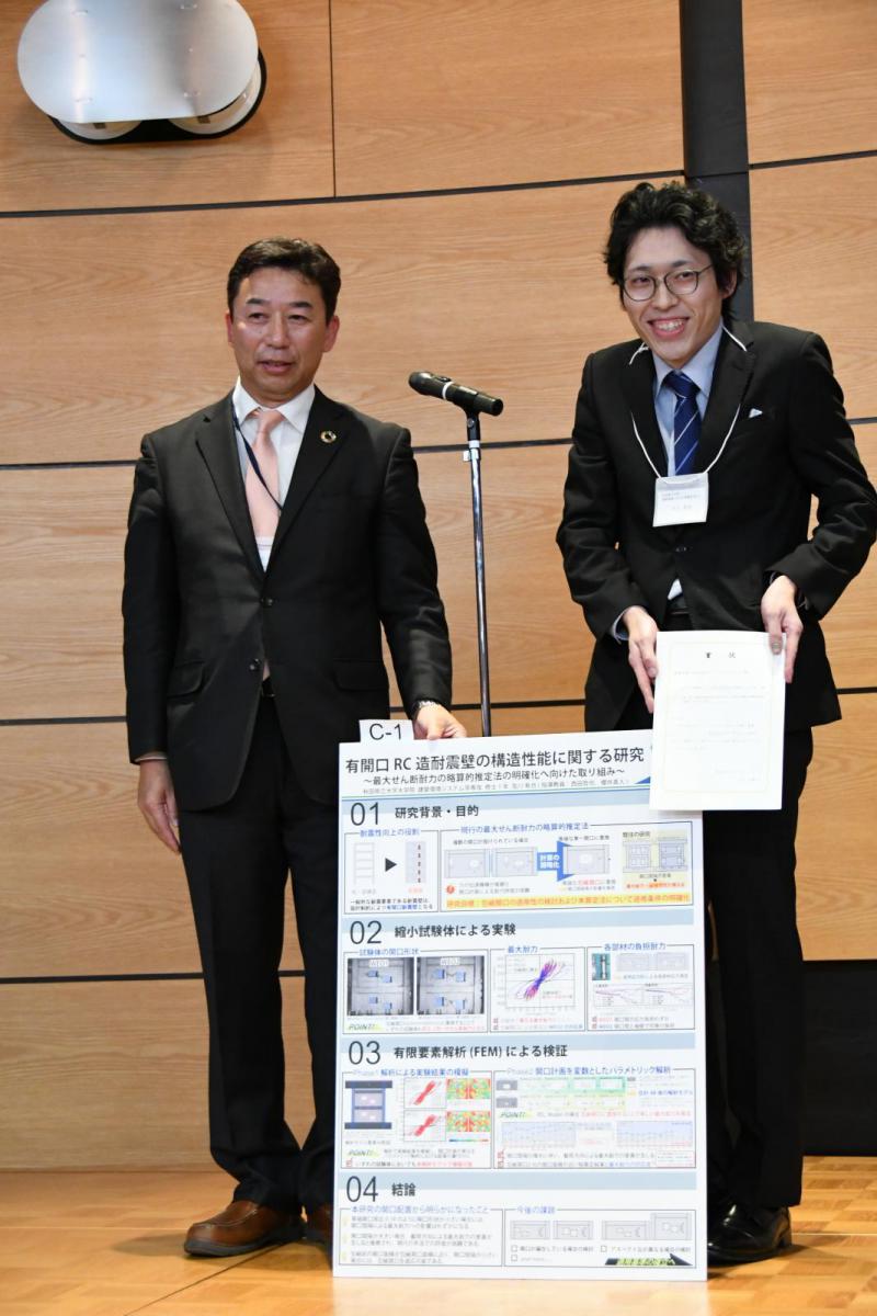 発表後は交流会が行われたのち、優秀発表者が表彰されました。最優秀の「本荘由利テクノネットワーク賞」には、システム科学技術学研究科 建築環境システム学専攻の及川有也さんの発表が選ばれました。ほか、6つの発表に企業賞が授与されました。