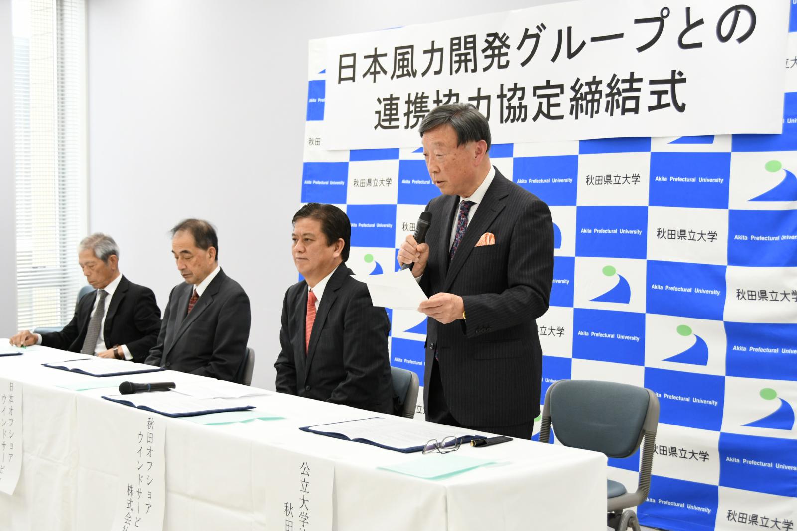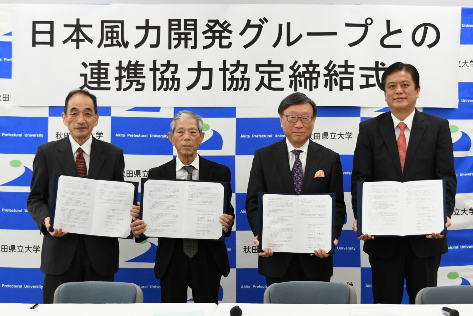 令和2年3月13日、日本風力開発株式会社、日本オフショアウインドサービス株式会社および秋田オフショアウインドサービス株式会社からなる日本風力開発グループと本学は、秋田県における地域への貢献と相互の発展に資するため、連携協力協定を締結しました。洋上風力に関する連携協定としては国内初となるものです。(日本風力開発株式会社様発表による。)