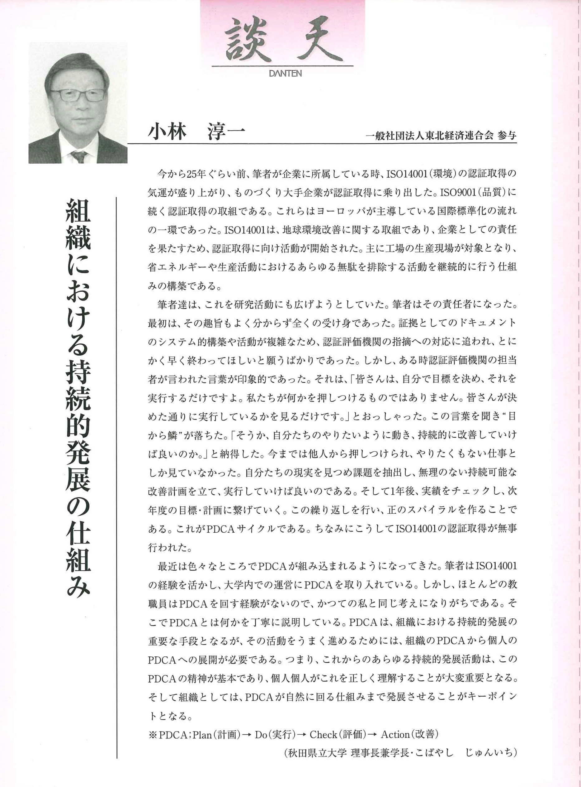 機関誌・東北経済連合会「談天」に小林学長のエッセイが掲載されました 一般社団法人 東北経済連合会が毎月20日に発行している機関誌・東経連の『談天』において、小林淳一学長のエッセイ記事「組織における持続的発展の仕組み」が掲載されました。 クリックするとエッセイをご覧いただけます