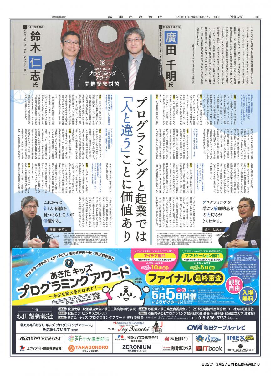 本学では情報工学科を中心として、秋田県内でのプログラミング教育の発展を支援しています。支援の一つとして、秋田魁新報社が主催するあきたキッズプログラミングアワードに企画段階から協力しており、このアワードの開催記念企画として、本学の廣田千明准教授と、ユビキタス創業者で現在ユビキタスAIコーポレーション・フェローの鈴木仁志氏との対談が行われました。プログラミングを学ぶことはどんな意味をもつのか、これからはどのような能力が重要になってくるのか、半生を振り返りつつ、それぞれの立場から語り合っています。この対談の内容は令和2年3月27日の秋田魁新報に掲載されています。ぜひご一読ください。