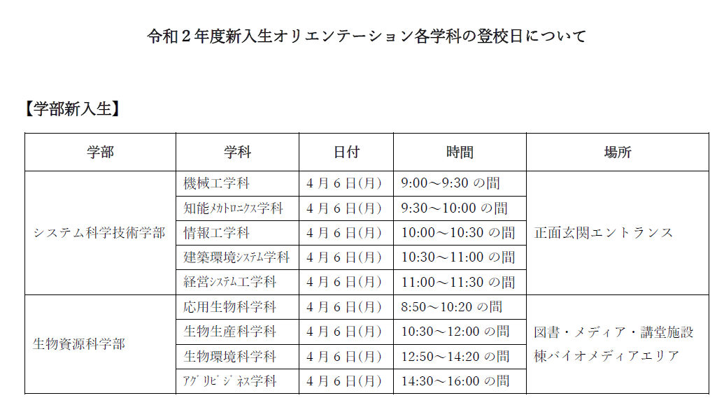 新入生 各位秋田県立大学では、新型コロナウイルス感染症の感染拡大に伴い、皆さんの安全を確保しながら授業を開始するため、4月6日(月)より、学科単位の小規模でのオリエンテーション等を実施することは先に連絡したとおりです。