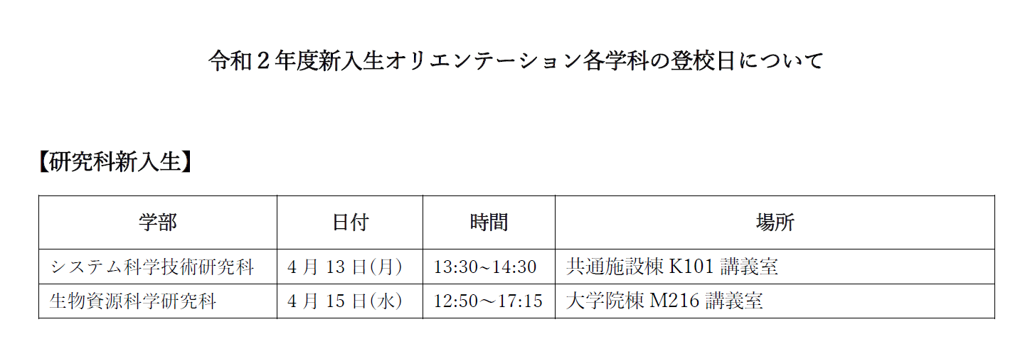 《研究科新入生》 令和2年度オリエンテーション各学科の登校日