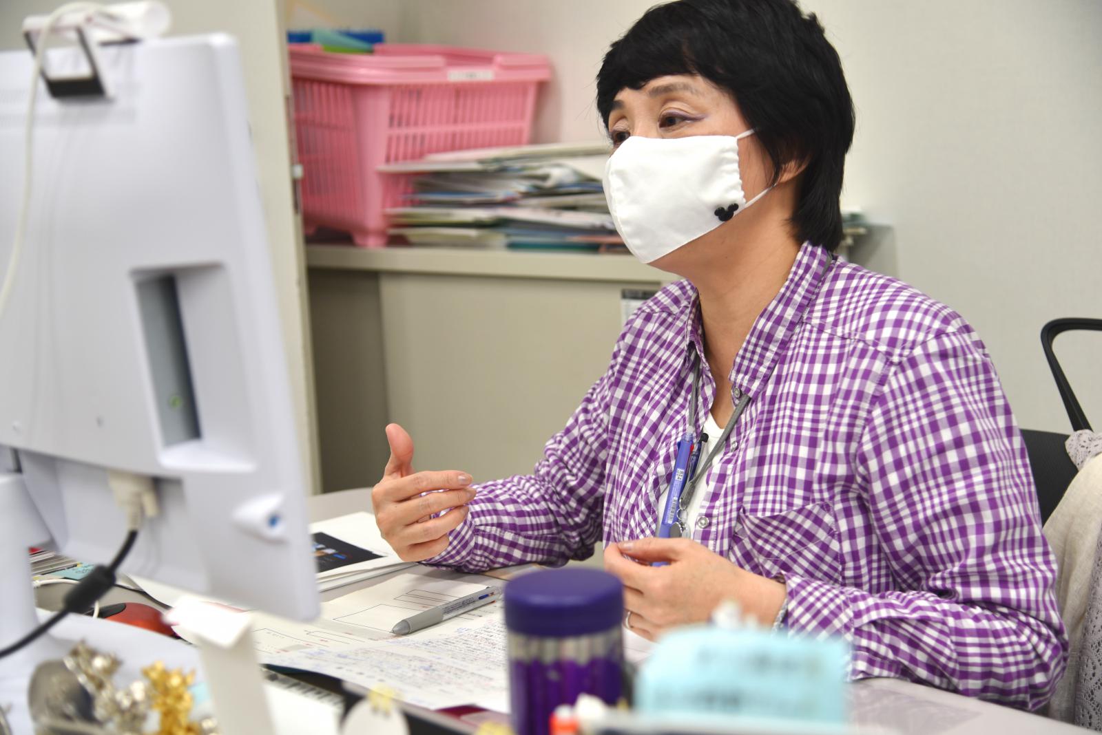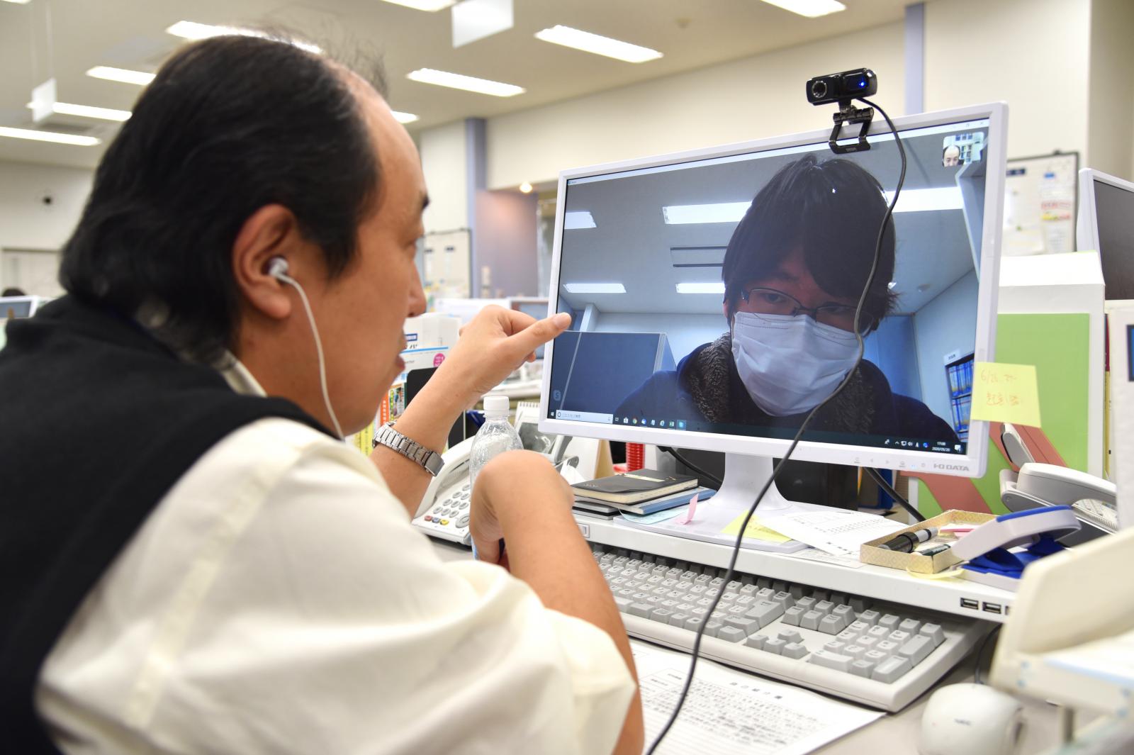 キャリアカウンセラーやキャリアセンター職員は、パソコン画面上でエントリーシートなどの書類添削や面接練習などマンツーマンでサポートしており、当センターでは今後も引き続き、学生一人ひとりの夢の実現に向けて、就活生を全面的にバックアップすることとしております。