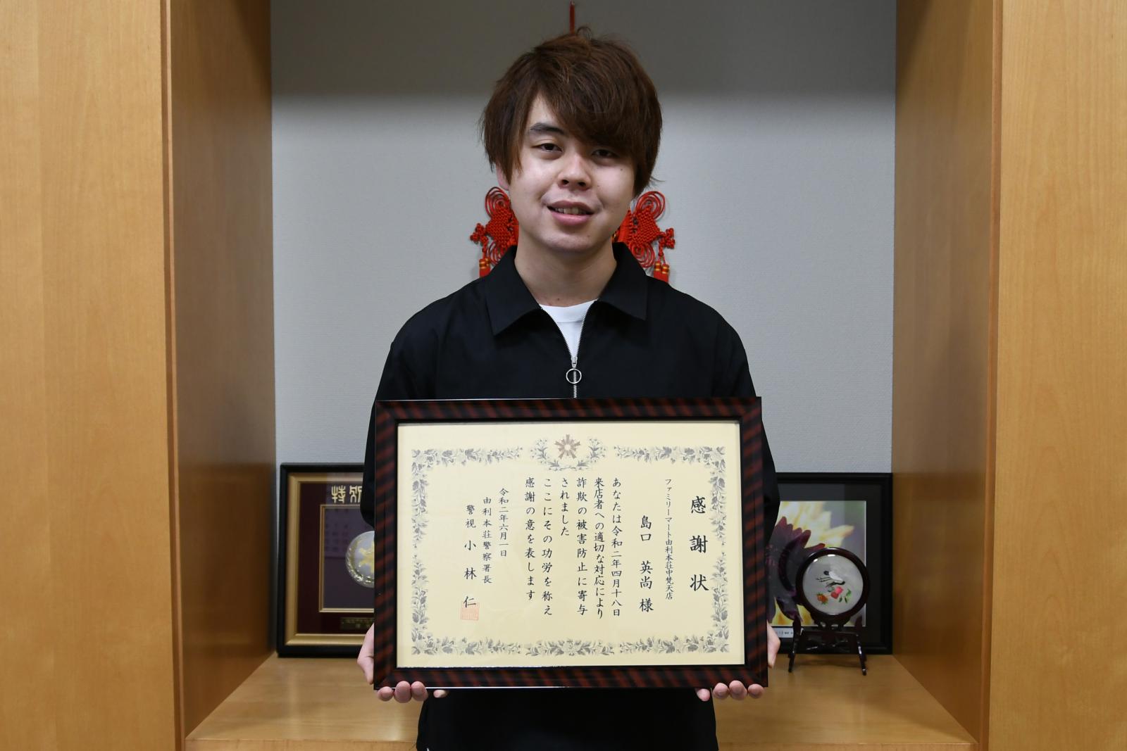 本学システム科学技術学部知能メカトロニクス学科3年生の島口英尚さんが、特殊詐欺被害の抑止に貢献し、由利本荘警察署より感謝状が送られました。島口さんは4月、アルバイト先のコンビニで、プリペイドカード購入の様子に違和感を覚え、購入しようとしていた方から事情を聞いて通報に繋げたとのことでした。由利本荘警察署からは感謝状の贈呈式を行いたい、という申し出もあったものの、新型コロナウイルスの影響もあり、6月1日にアルバイト先を通して感謝状が手交されました。