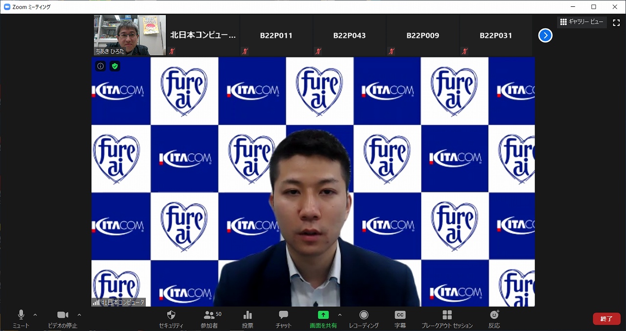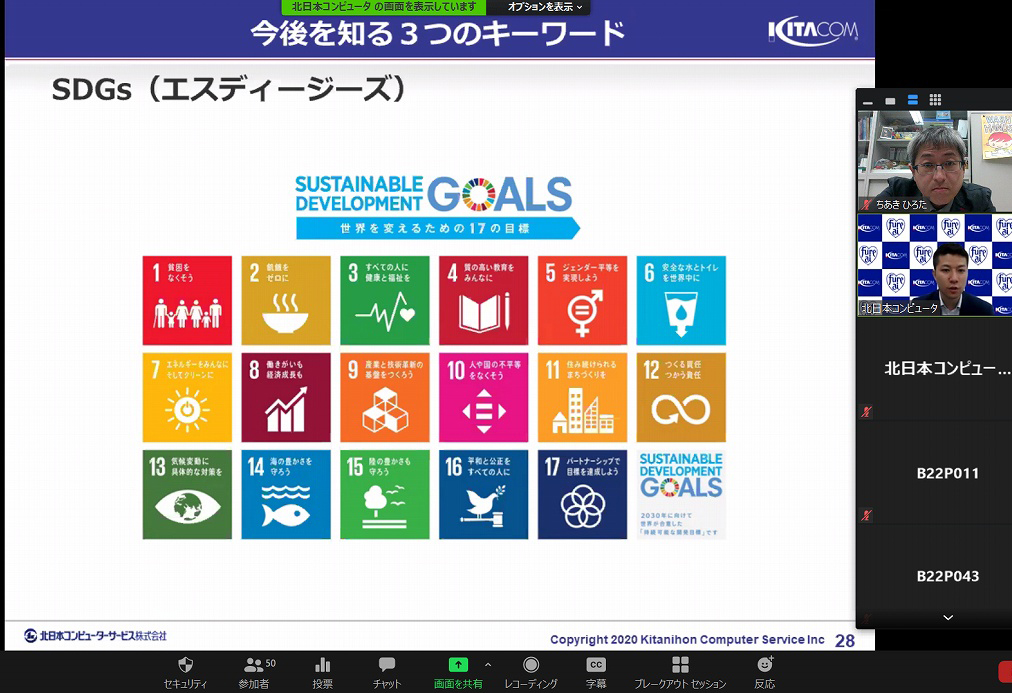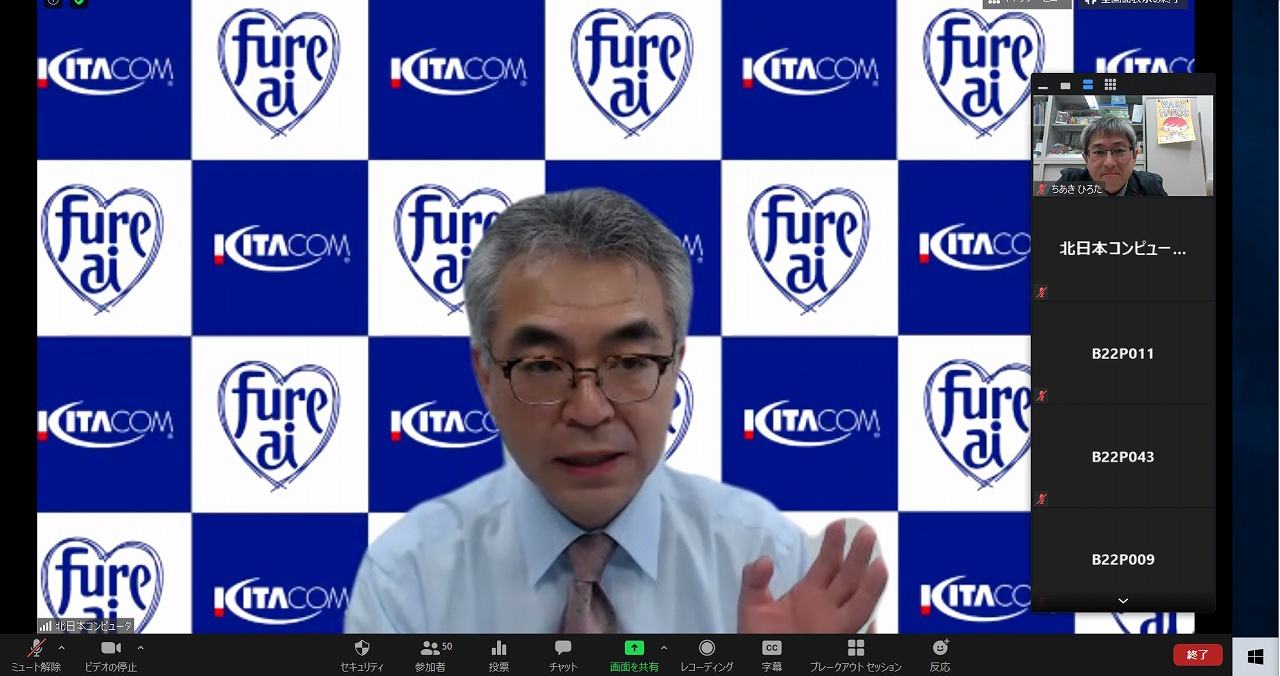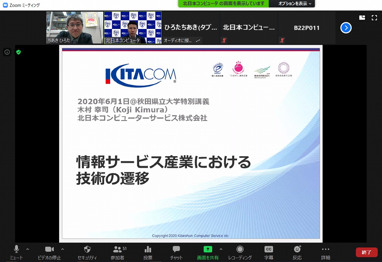 システム科学技術学部情報工学科では、学生と社会との接点を増やす目的で、企業の方を講師に特別講義を実施しています。本年度は令和2年6月1日、情報工学科の1学年を対象とした必修科目「情報科学の基礎(情報)」において、情報産業で働く方を講師として、「情報産業とは何か」についてご講演いただきました。講師は秋田県情報産業協会会長で北日本コンピューターサービス株式会社代表取締役社長の江畑佳明氏と、同じく北日本コンピューターサービス株式会社の木村幸司氏にお願いしました。なお、今年は新型コロナウイルスの感染拡大防止のためすべての授業が遠隔で実施されており、本講義も秋田市の北日本コンピューターサービス社から遠隔で実施しました。講義の前半は木村氏より、情報サービス産業における技術の遷移について説明があり、Society5.0や国内企業の動向などをお話しいただきました。後半は江畑氏から経営者の立場から、企業の社会貢献についてお話いただきました。受講した学生たちは、講演内容をもとに自分たちの将来に思いを馳せました。企業の方からお教えいただいた内容を、これからの学生生活に活用してくれることを期待しています。