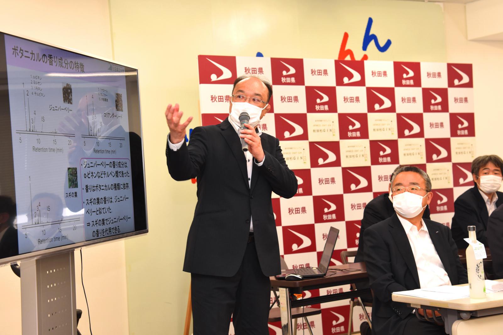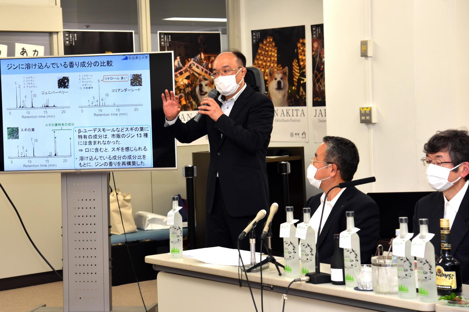 生物資源科学部の野下浩二助教(生物生産科学科)が開発プロジェクトのメンバーとして取り組んだ、天然秋田杉の香りを再現したクラフトジン『秋田杉GIN』が完成し、6月29日、秋田県庁でお披露目されました。本プロジェクトは、クラウドファンディングによる資金調達でスタート。産学官連携により1年以上に及ぶ研究開発を経て、オエノングループの秋田県醗酵工業株式会社から全国で発売を開始しました。香りのスペシャリスト野下先生はこのプロジェクトでジンの肝となる香りの成分分析を担当しました。