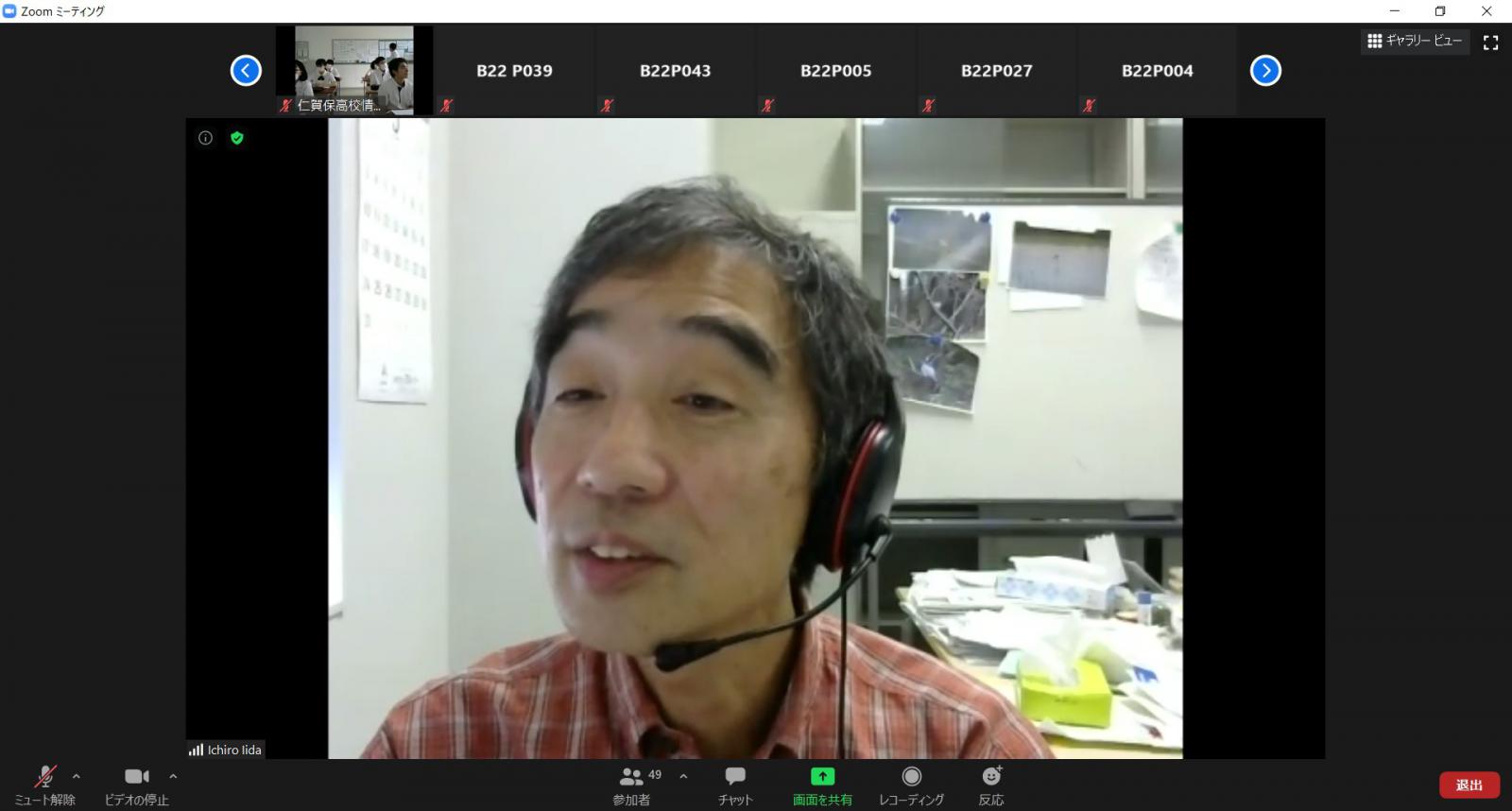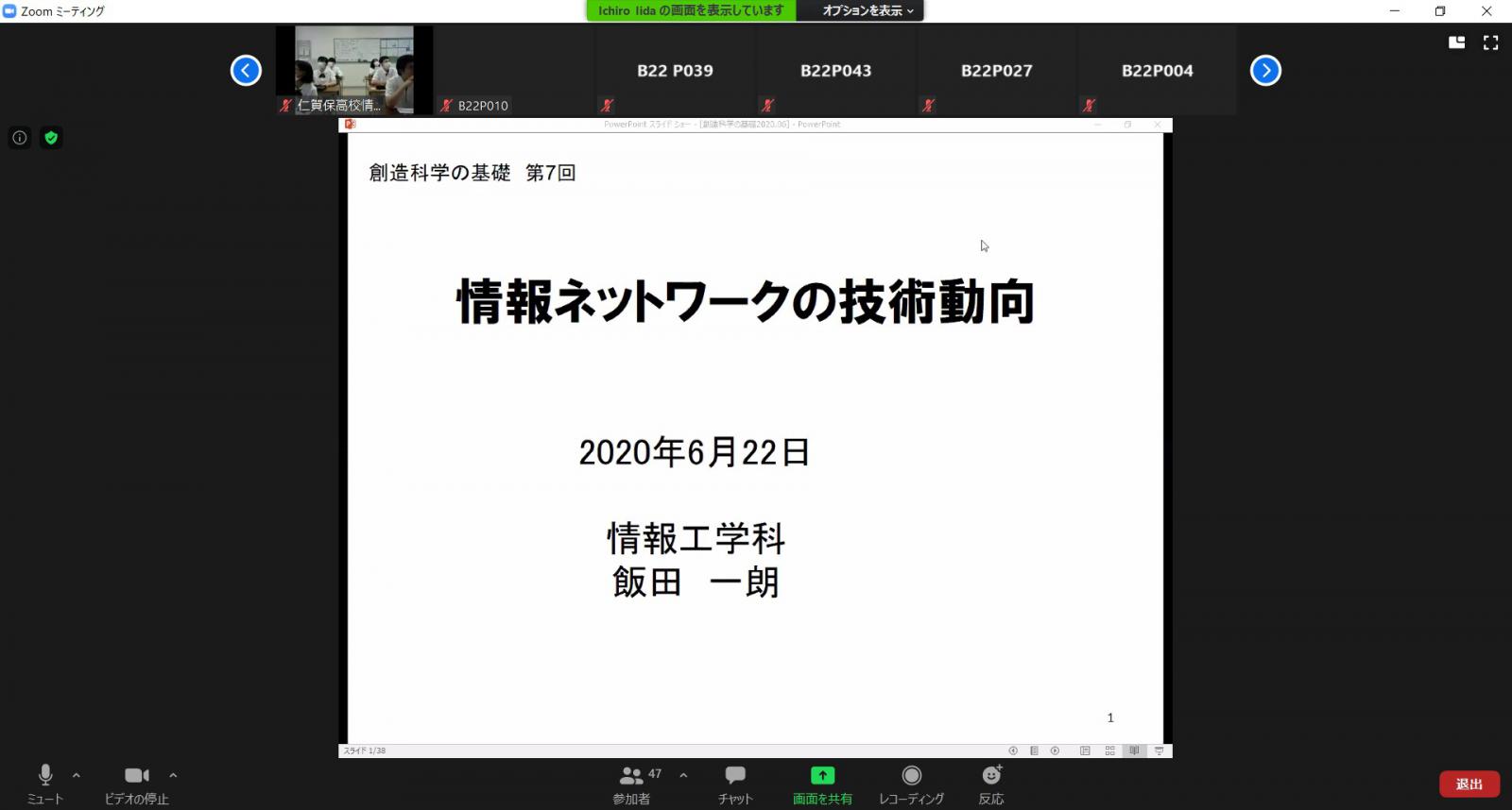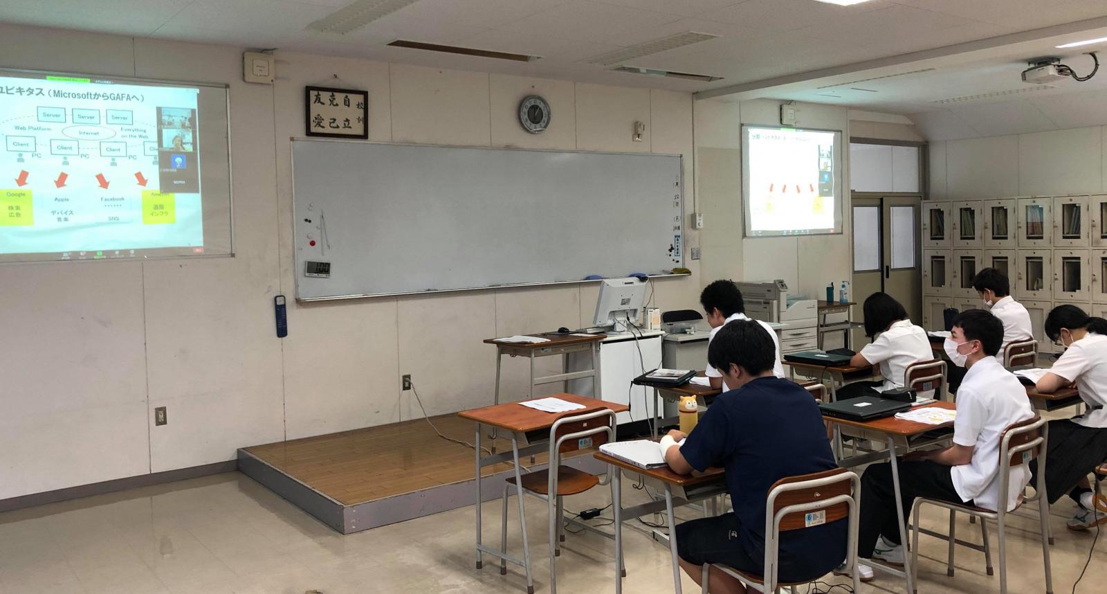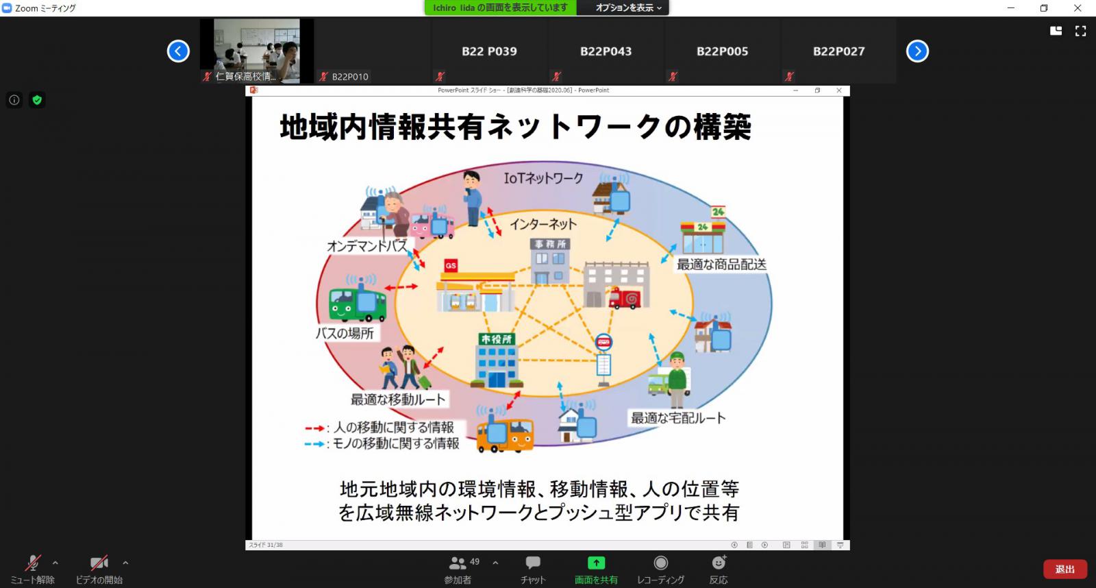 システム科学技術学部情報工学科の1年生を対象とした講義「創造科学の基礎(情報)」では、オムニバス形式で情報工学科の教員がそれぞれの研究内容をわかりやすく解説しています。仁賀保高等学校情報メディア科より、大学の学修を体験することにより、生徒が進路について考えるきっかけを作りたいとの相談があり、上記の講義を仁賀保高校生に受講していただく連携授業を実施することにしました。現在、本学では講義はすべて遠隔で実施しているため、大学の講義を仁賀保高校に中継する形で授業に参加していただきました。初回は6月22日に飯田教授による「情報ネットワークの技術動向」がZoomによるリアルタイム型の授業として実施され、仁賀保高校の教室に中継されました。仁賀保高校では10名の生徒が受講し、情報システムの変遷や近年、飯田教授が取り組んでいる情報ネットワーク技術を用いた地域活性化の事例について学びました。なお、この授業の様子は令和2年7月4日の秋田魁新報に報じられています。