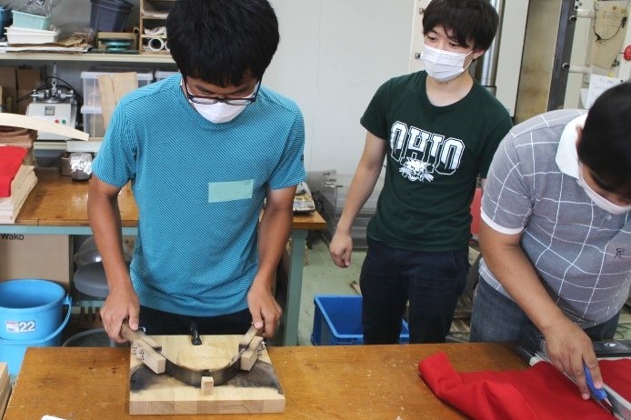 試験体用の木材をカットしたり、接着や測定作業などを体験していただいたほか、試験体の測定では、木材高度加工研究所で卒業研究中の生物資源科学部4年生が講師になり、作業のポイントや様々な樹種の特徴などを説明しました。年齢が近いこともあり、生徒さんはリラックスした雰囲気で作業を進めることができました。