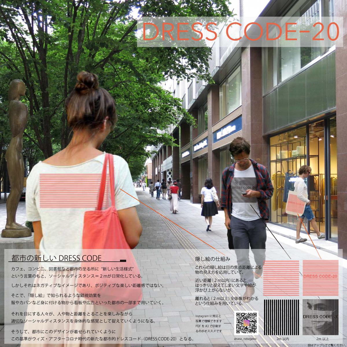 デザインコンペ『Social Good Distance DESIGN COMPETITION 〜都市空間の新しい遊び方、楽しみ方のデザイン〜』において、本学システム科学技術学部建築環境システム学科、計画学講座4年の笹恭輔さんと中川睦さんのグループによる提案「DRESS CODE-20」が、応募180点のなかから最優秀作品5作品に選ばれました。このコンペは有楽町「micro FOOD & IDEA MARKET」他が主催するもので、新型コロナウイルス感染拡大を抑えるための“ソーシャルディスタンス=2m”を、より良く生活に組み込むためのアイデア、デザインを競うものです。