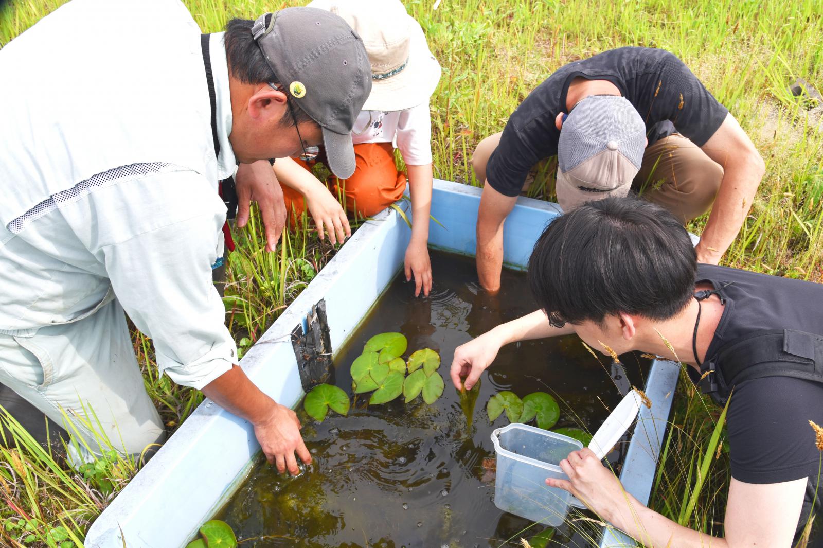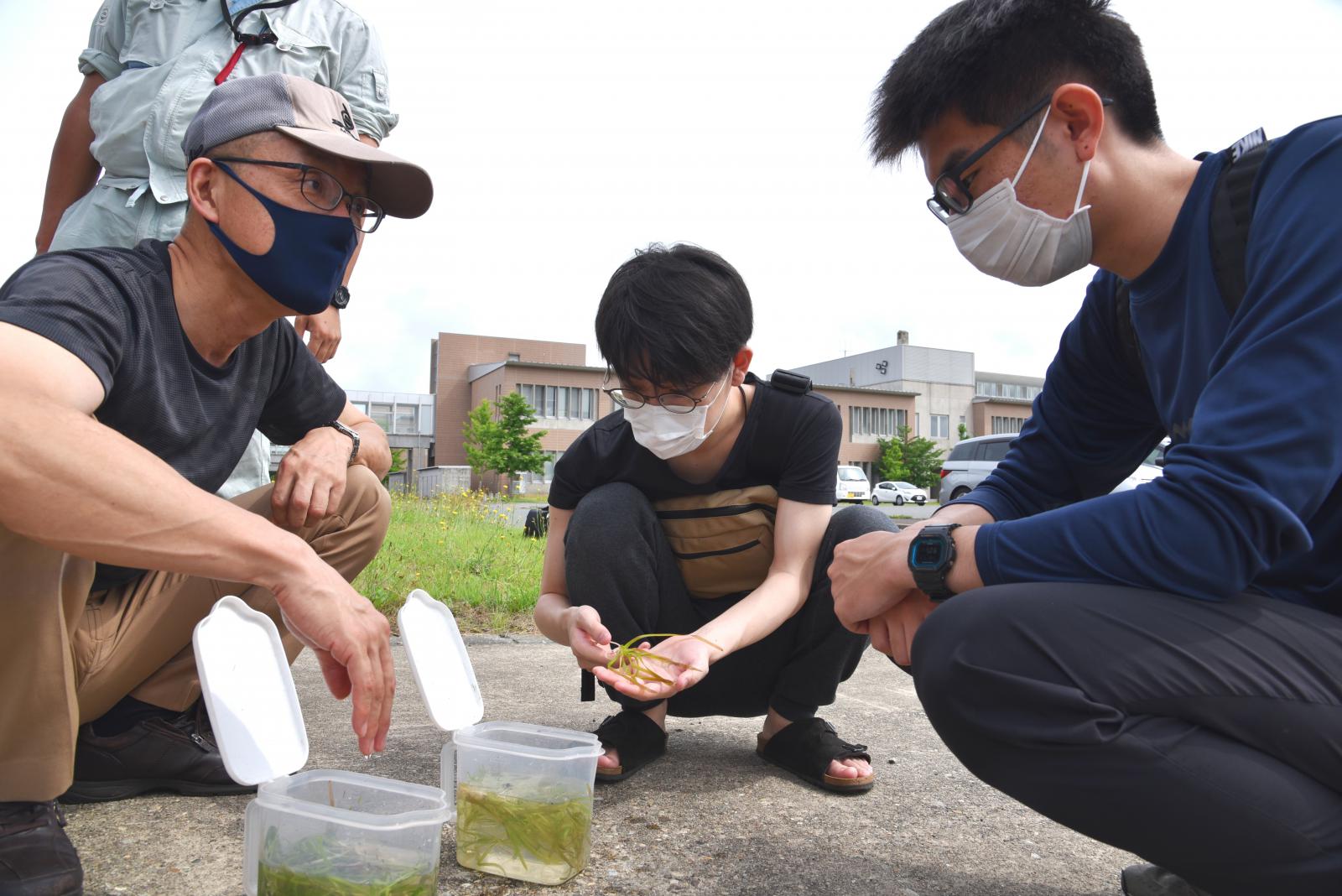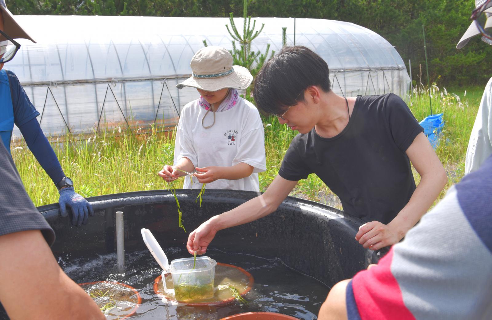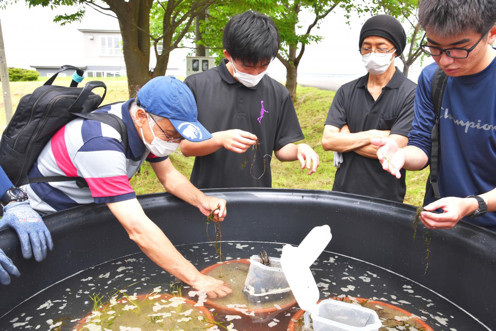 この度、NPO法人はちろうプロジェクトは、千葉県立中央博物館の主任上席研究員である林紀男先生を招き、八郎潟の水草(モグ)を復活させる水槽の設置と水草の植え付け作業を行いました。同法人は、八郎湖流域をフィールドに、環境学習や八郎湖と住民をつなぐ流域ネットワークの構築等の活動を通じて、八郎湖再生を担う人材を育てる活動を展開しており、本学生物資源科学部の谷口吉光教授(生物環境科学科)が副代表理事、大学院・生物資源科学研究科の鎌田洋平さんがコーディネーターを務めております。