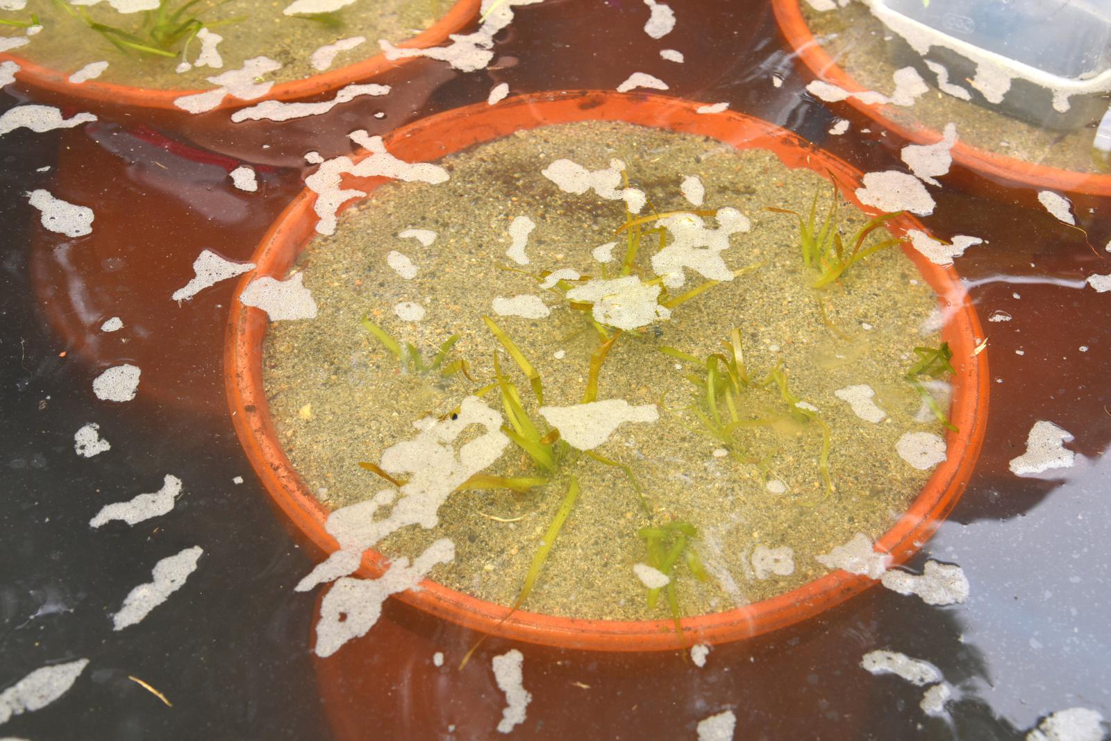 植え付けた水草は、エビモ、コウガイモ、セキショウモ、クロモ、センニンモなどで、いずれも八郎潟で生まれ育った土着の水草です。林先生からの「水草が増えれば、それをすみかにしてミジンコが増え、アオコを食べて水をきれいにしてくれる」というビオトープ管理のアドバイスを、正に実践する場になります。