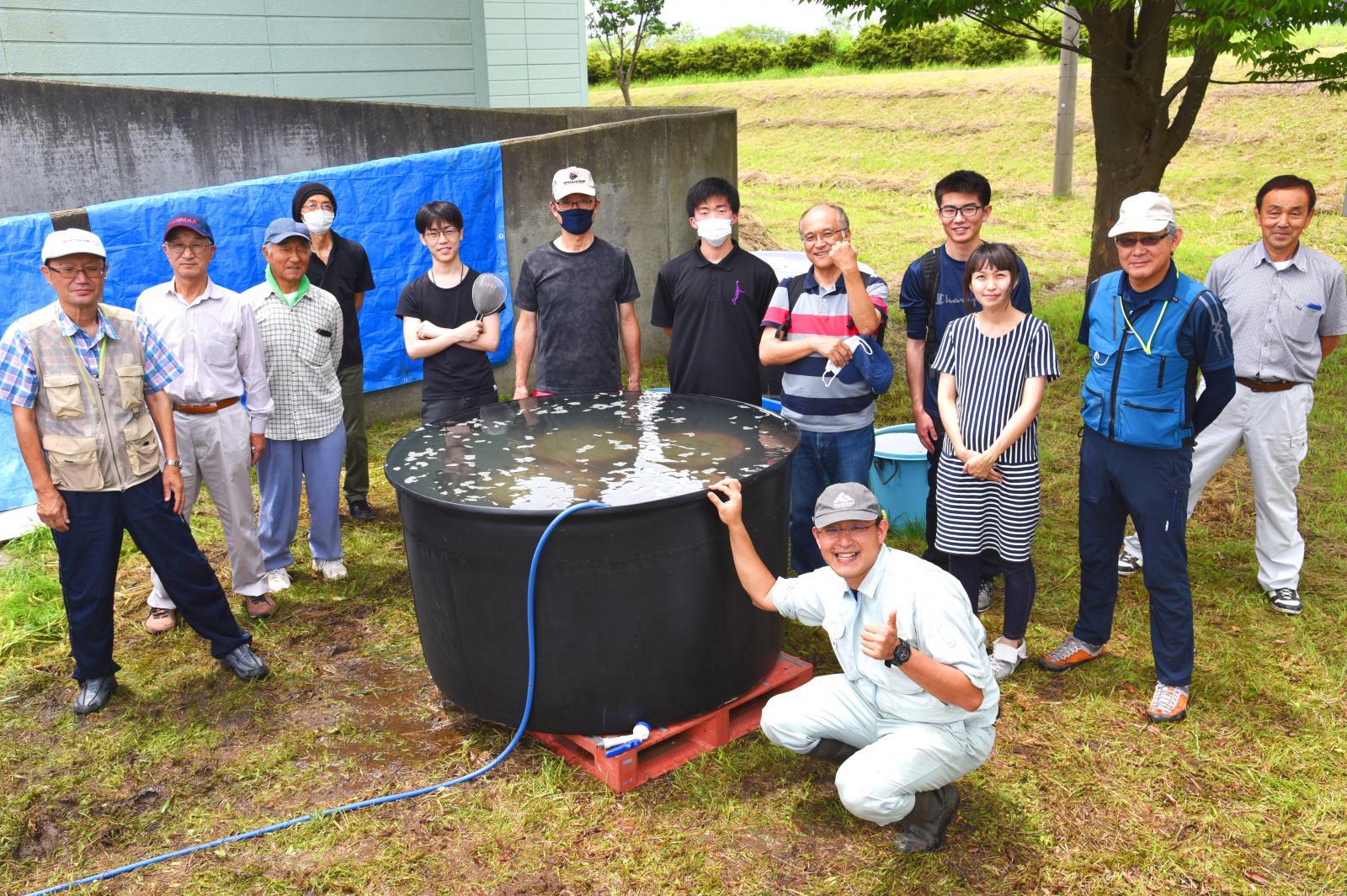 今回設置した水槽は、昨年度「生きものふるさと水槽」として井川町立井川義務教育学校に設置された水槽と同じもので、八郎潟干拓前の地層から種子を掘り出し、八郎湖に水草を戻そうというプロジェクトの第一歩となる活動です。この水草の苗は生物環境科学科生態工学研究室により、干拓前の八郎潟の水草が残る旧船越水道のため池などから、埋土種子を採取することで再生されたものです。